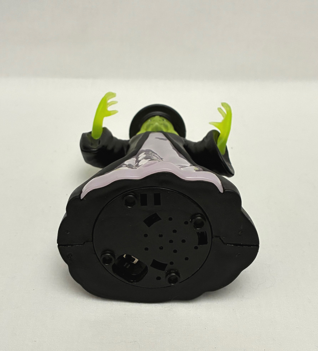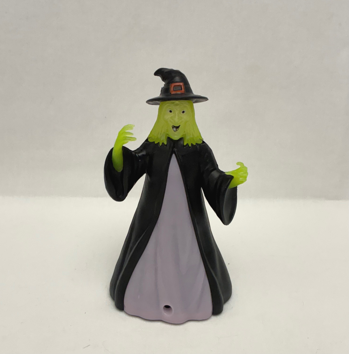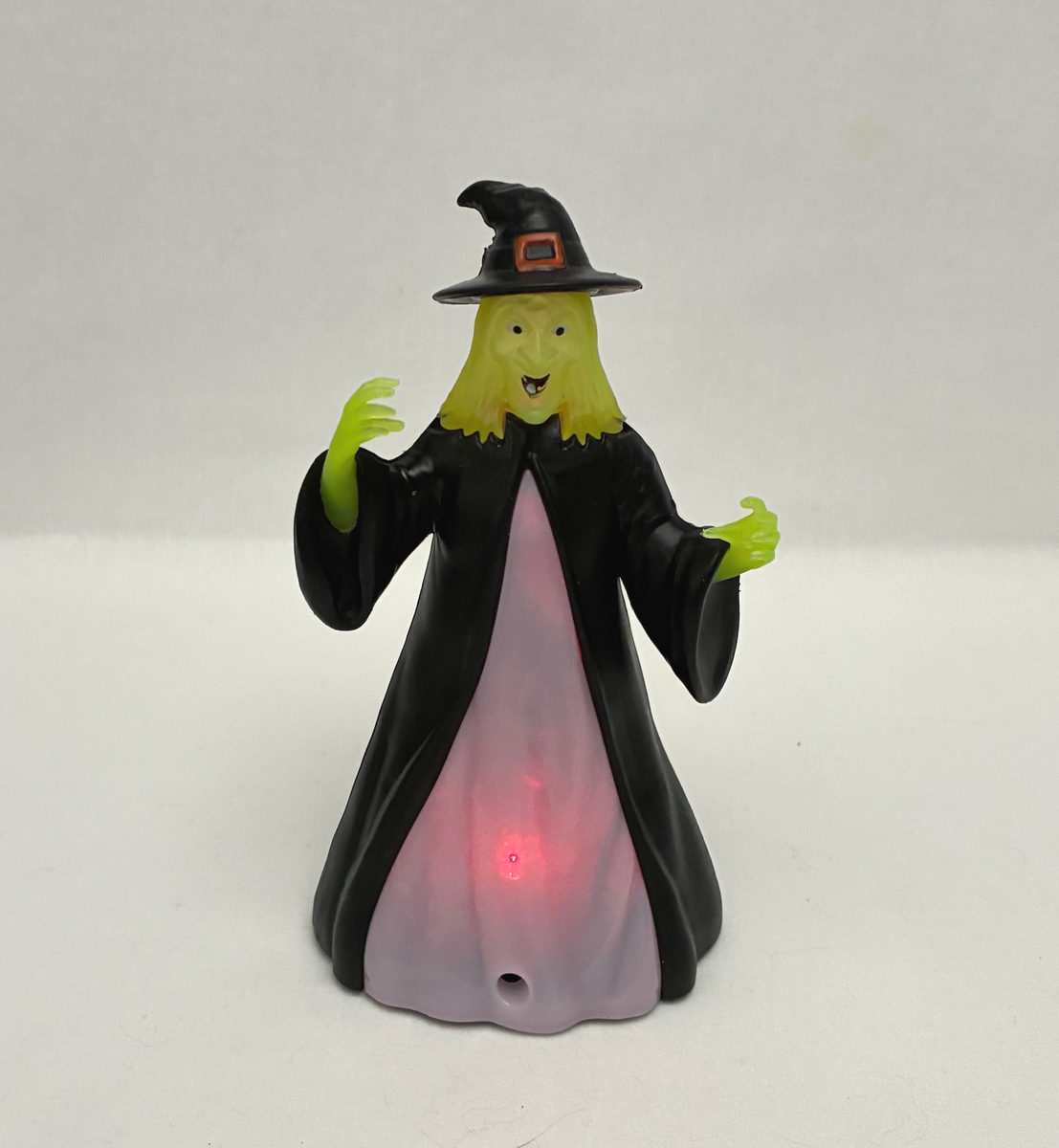 This is a vintage Halloween witch blow-mold plastic toy or decoration, and she lights up in different colors while laughing in a loud cackle any time her motion sensor detects movement. I believe she was made in the late 1990s or early 2000s. She stands 6" tall and I think runs on watch batteries (I didn't open her up because her batteries are still working just fine and I wasn't sure how to do it properly). There's no brand name on her anywhere, so I can't tell you a manufacturer name. She's really in excellent condition, no signs of wear or damage, and she works great. The only thing I would mention is that her motion sensor is sometimes a little bit moody. She might just be trying to get you to drop your guard, though! Don't trust her! Haha! Asking $9.00 obo. Everything I have listed for sale is "or best offer", so feel free to make an offer.