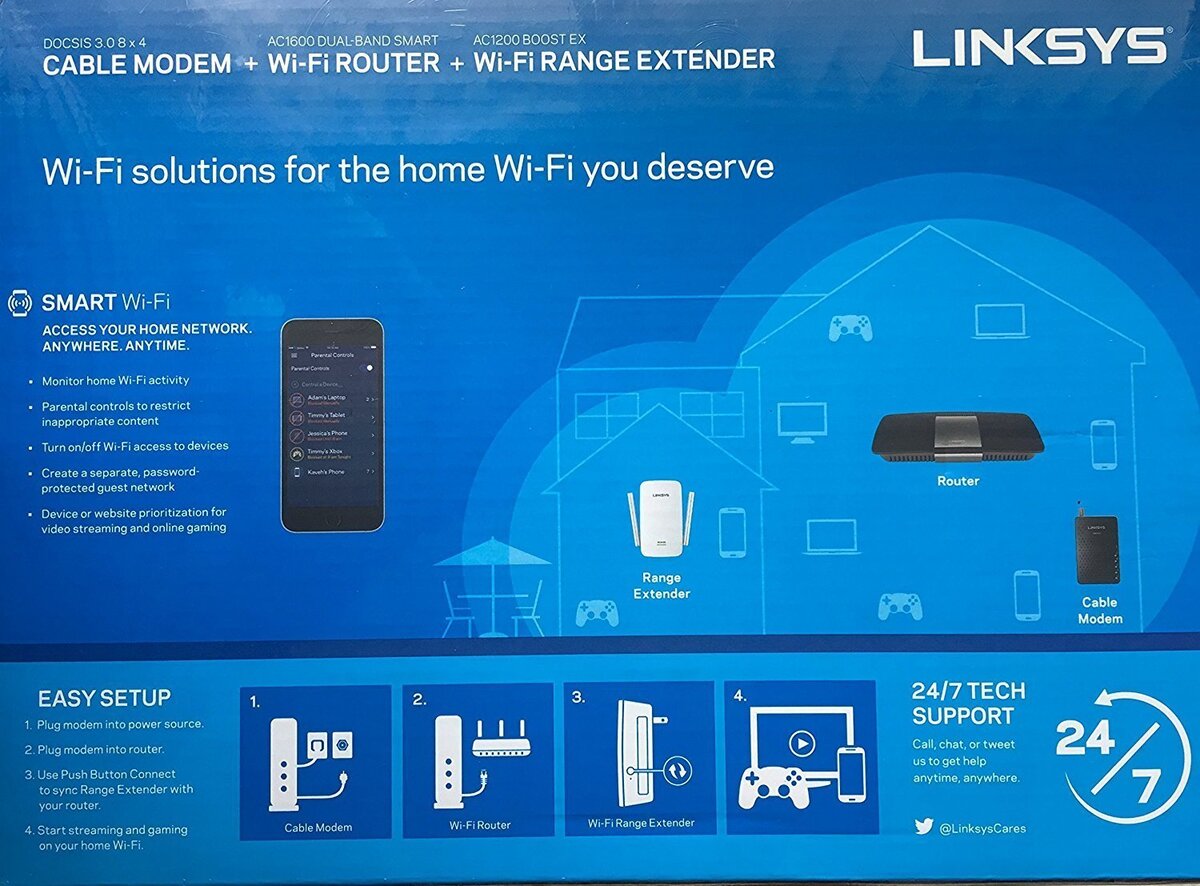 Product description: F5Z0644 Triple Combo pack: Includes the Linksys AC1600 (EA6400) Dual-Band Smart WiFi Router, the Linksys AC1200 (RE6400) BOOST EX WiFi Range Extender, and Linksys CM3008 DOCSIS 3.0 Cable Modem.