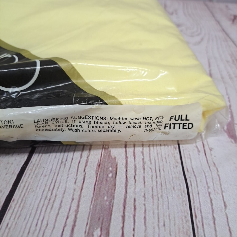 This vintage Cannon Monticello full fitted sheet in yellow is designed for a 54"x76" mattress. Made in the USA from a polyester and cotton blend, it features a solid color style with a vintage aesthetic. The set includes a fitted sheet and is a new old stock (NOS) item. Perfect for adding a touch of period style to your bedding collection.