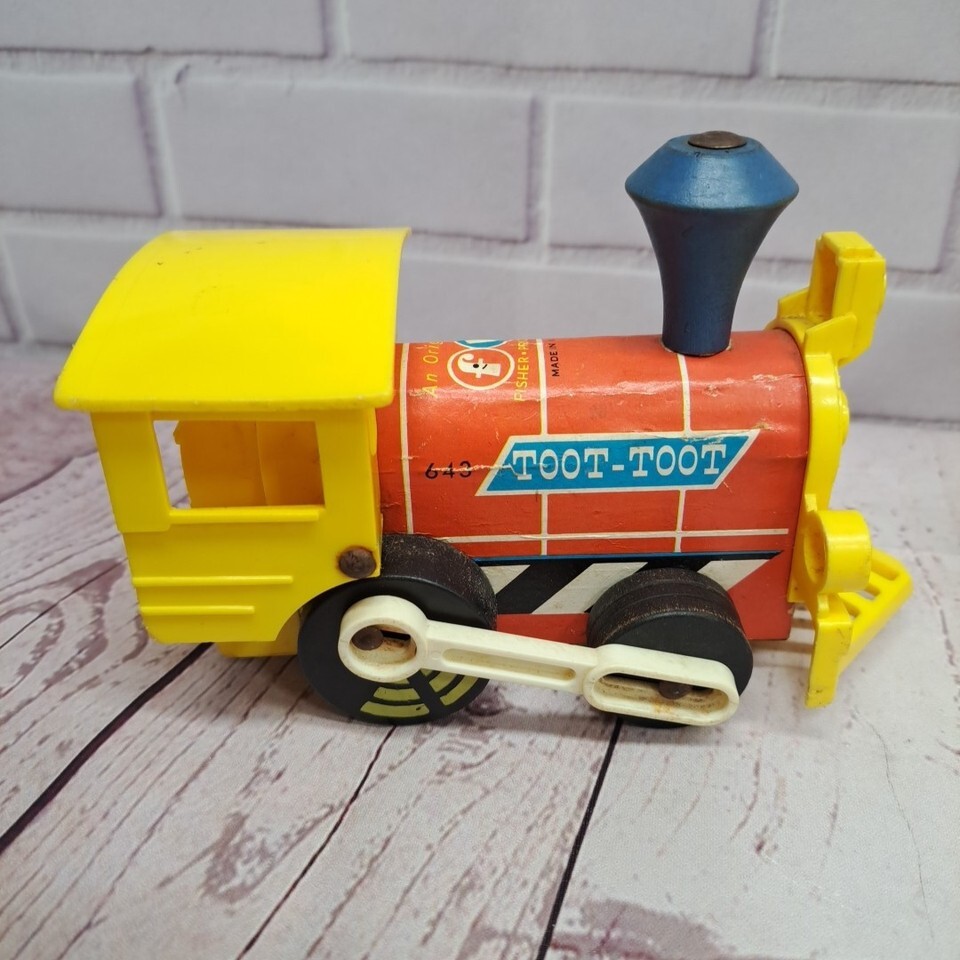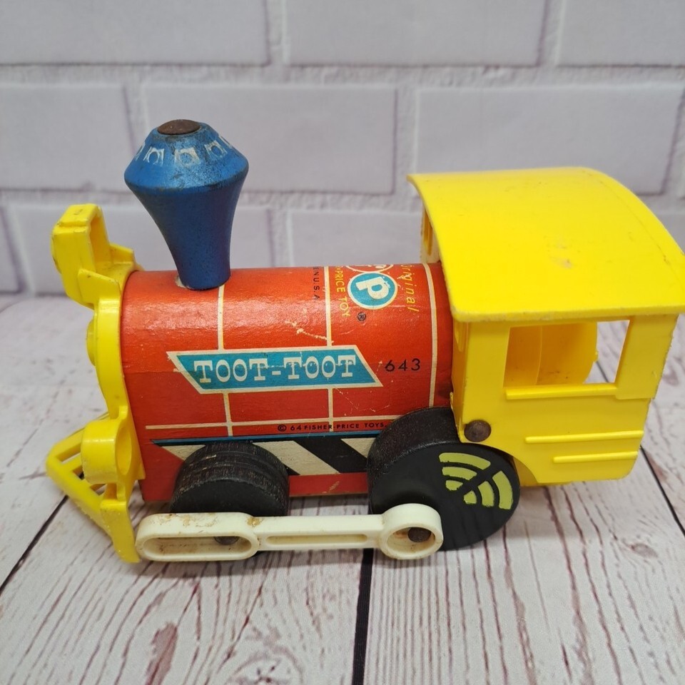 Could use a good cleaning but are in general good condition for age. The vintage Fisher-Price Toot Toot Train lot from 1964 includes three items. Made in the United States, this classic toy features pull toys that have been loved by children for generations.