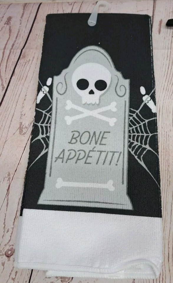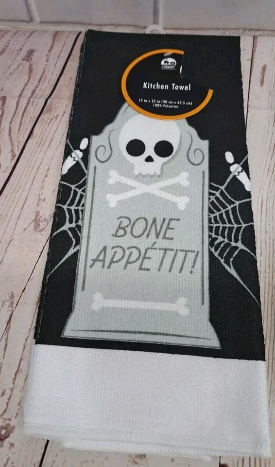 Add some spooky fun to your kitchen with this 4-piece Halloween-themed set. The set includes a kitchen towel, two pot holders and a oven mitt, all featuring a spooky skeleton design. The Black/white set is perfect for Halloween and any other occasion, and is sure to add a touch of Gothic style to your dining table.
