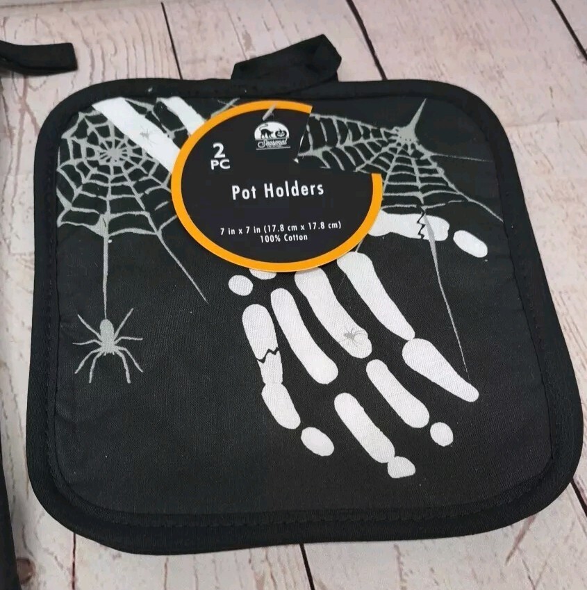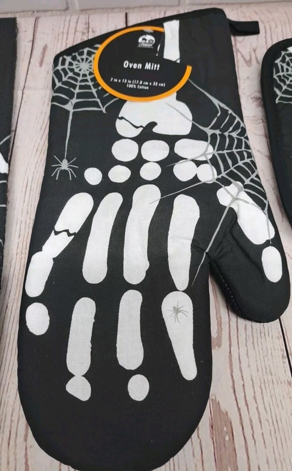 4pc Halloween Spooky Skeleton Spider Web Tombstone Pot Holders, Oven Mitt, Towel