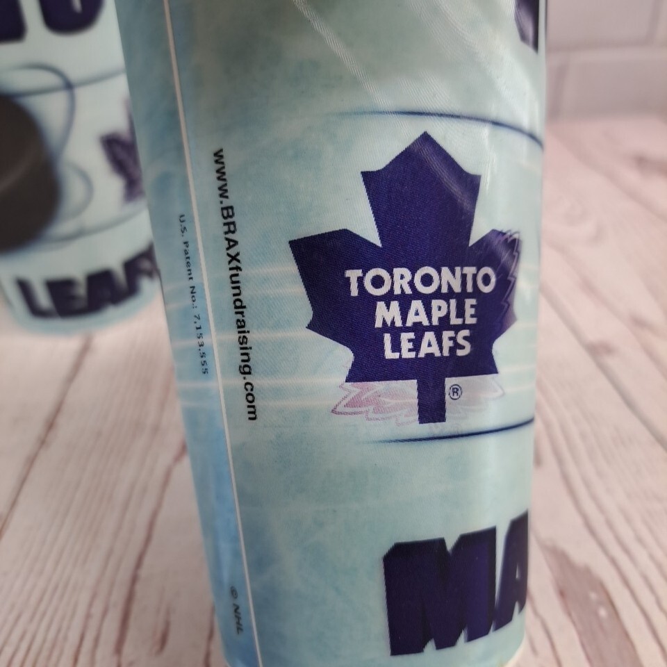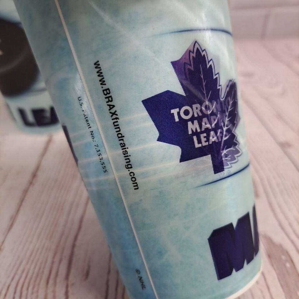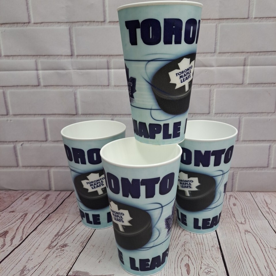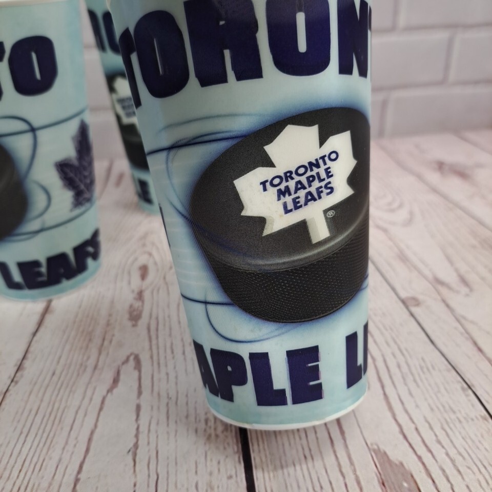 The product is a set of four NHL Toronto Maple Leafs hockey puck plastic cups featuring hologram prints. Each cup serves as a souvenir item for fans of the hockey team, showcasing their team logo and colors. These original cups are a unique and collectible way for fans to display their support for the Toronto Maple Leafs during hockey games or other sports events.