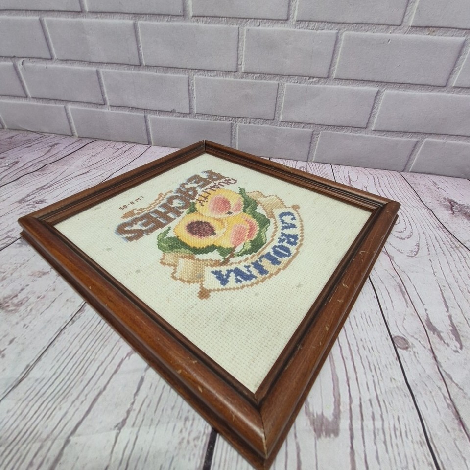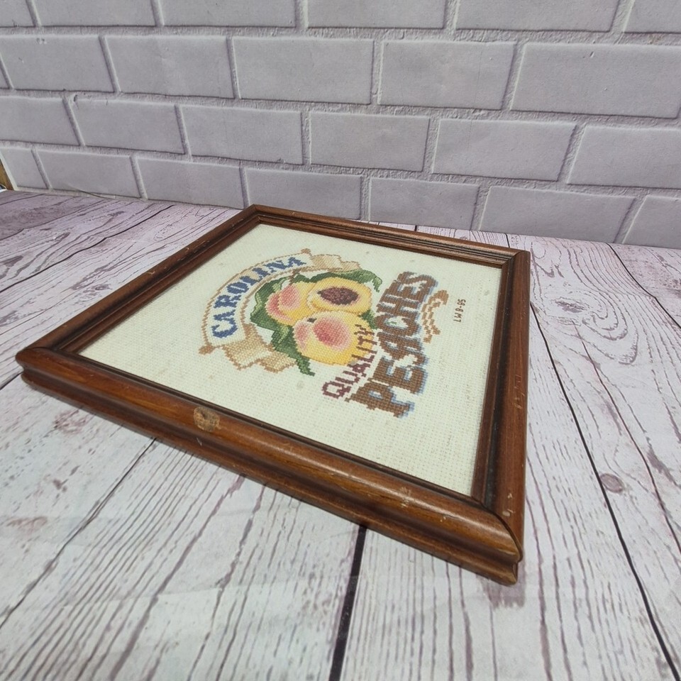 The product is a vintage handmade finished cross stitch framed piece featuring a design of peaches, created in 1985. This unique piece measures 8.5 inches and is made with high-quality craftsmanship. The intricate cross stitch embroidery adds a touch of nostalgia and charm to any home decor, making it a lovely collectible item for those who appreciate traditional hand-stitched art.