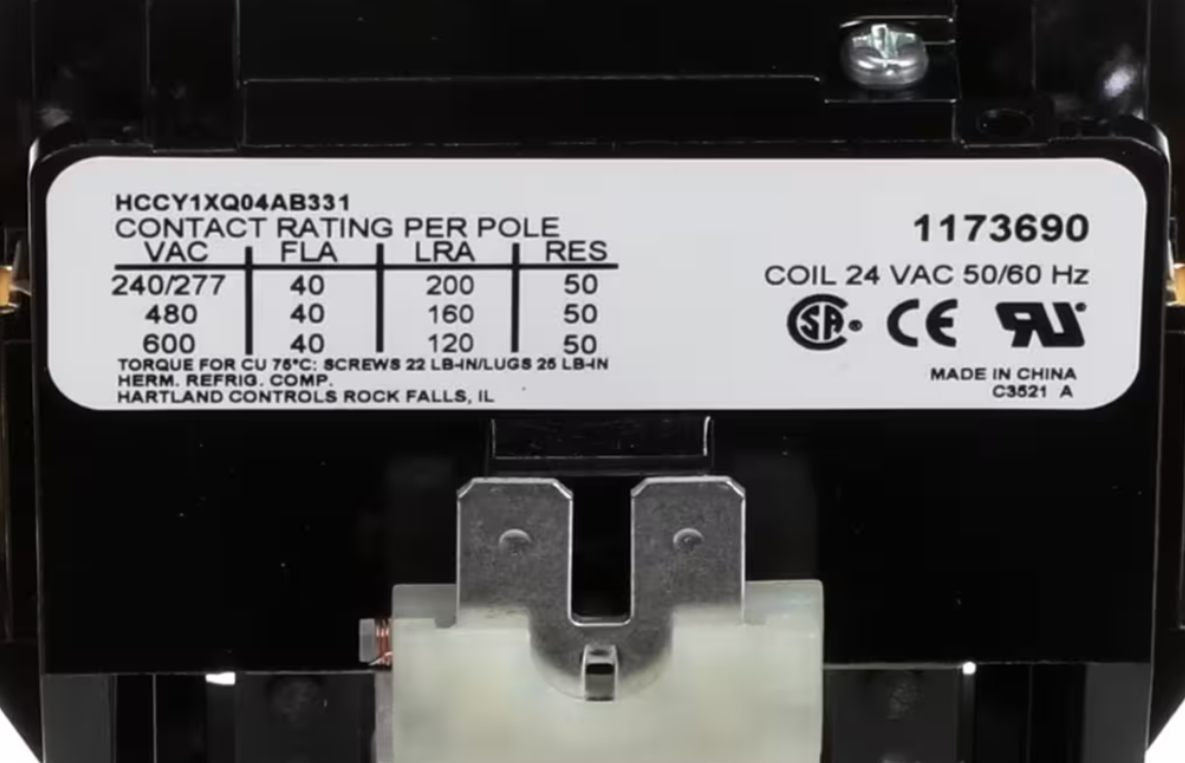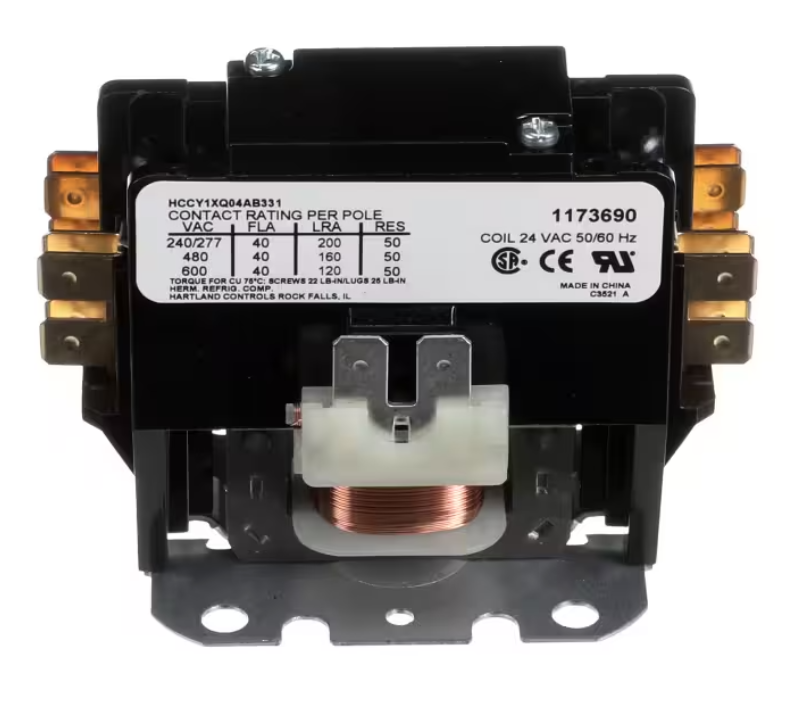 International Comfort Products HCCY1XQ04AB331 / 1173690 Contactor is a 2 pole electrical contactor designed for air conditioner systems requiring reliable low-voltage control. Featuring a 24 volt coil with 50/60HZ compatibility and rated at 40 Amps, this contactor provides dependable electrical switching and stable performance in residential and commercial HVAC applications. Ideal for replacement or maintenance to restore proper system operation and electrical safety.
