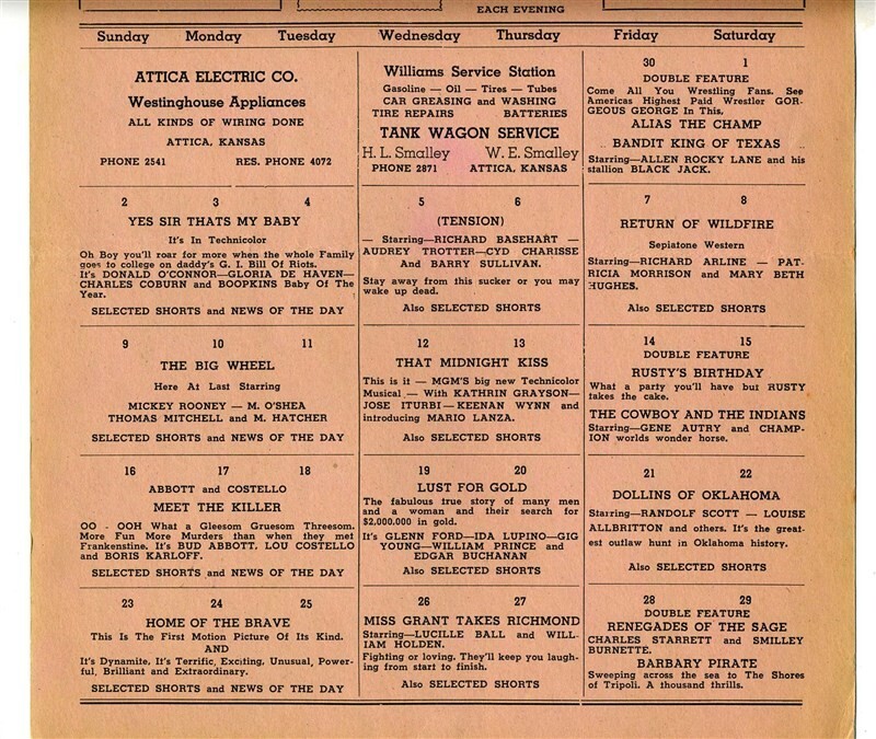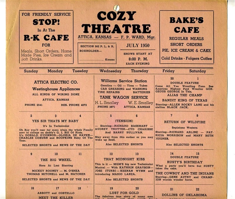 A 9 1/2 " x 11 1/4 " single sided poster on card stock of the movies being shown during the month of July 1950 at the Cozy Theatre in Attica, Kansas. With Abbott and Costello, Boris Karloff, Mickey Rooney, Gene Autry, Randolf Scott, Lucille Ball, Glenn Ford, Mario Lanza, Cyd Charisse, and many more. In very good condition with a bent corner.