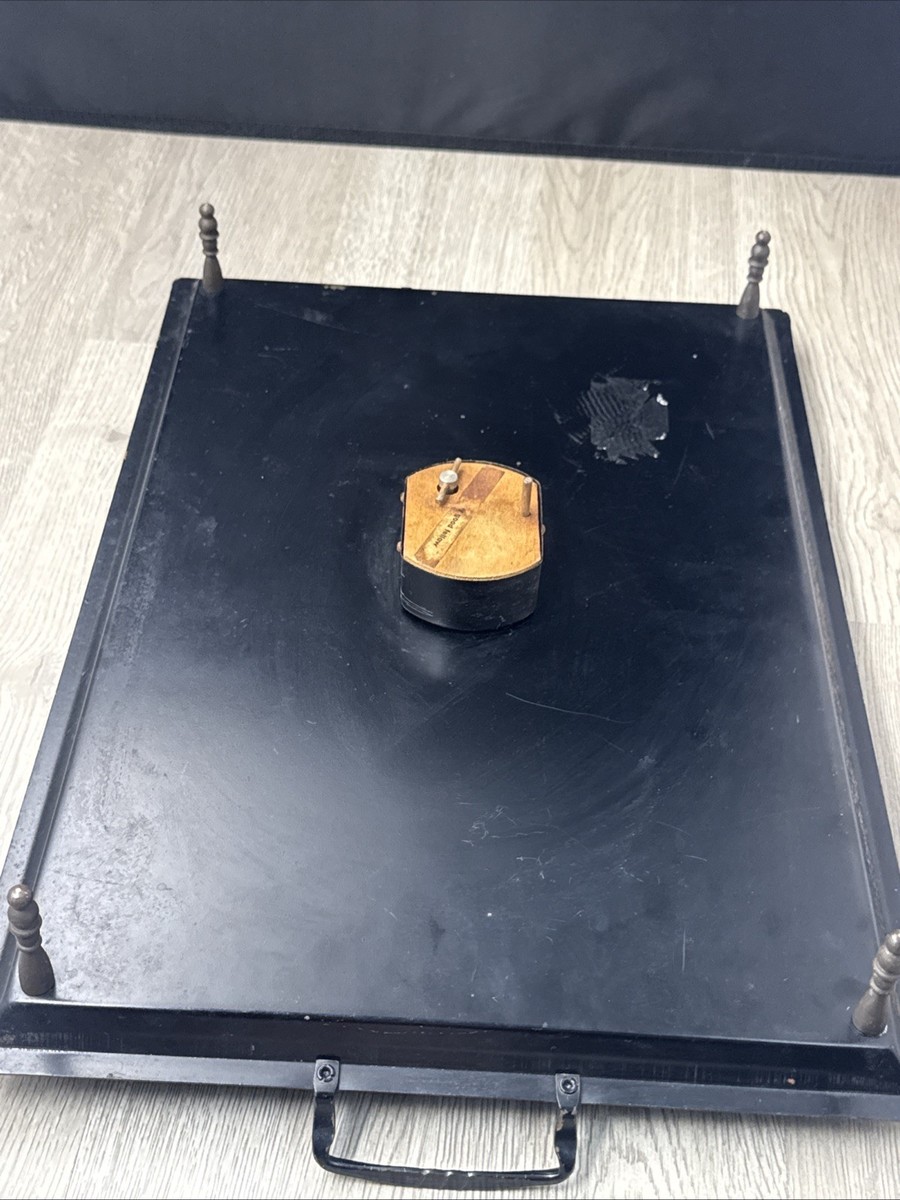 Serving tray sits on four legs all original. Three of the screws are original, one screw has been replaced. There is a pressure switch activated music box on the bottom of the tray that is in good working condition. So when you lift up the tray, the music begins, and when you put the tree down the music stops.