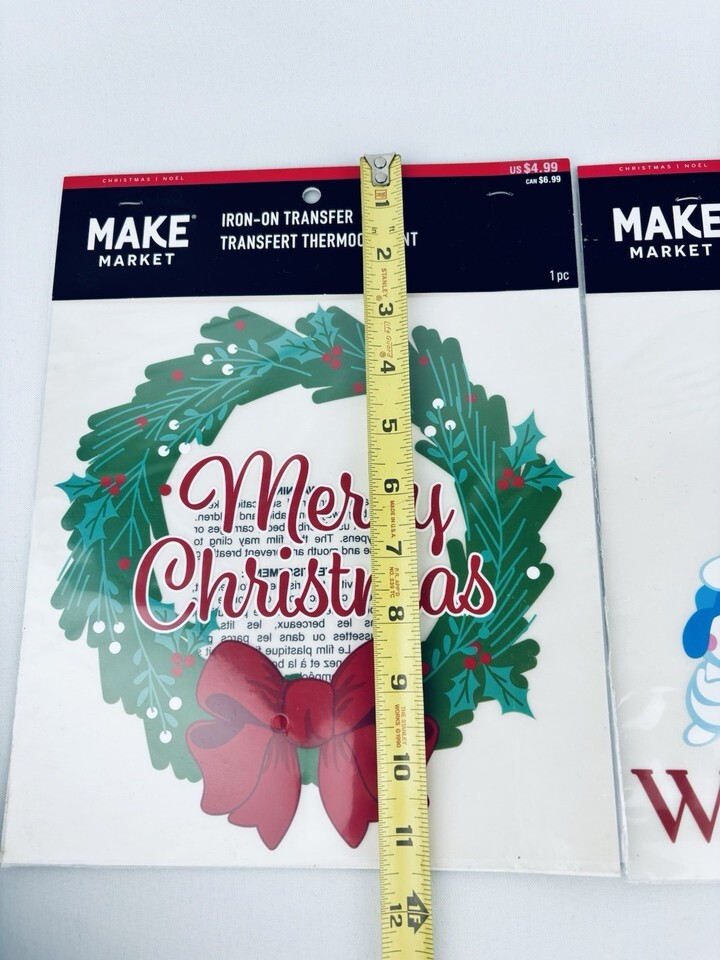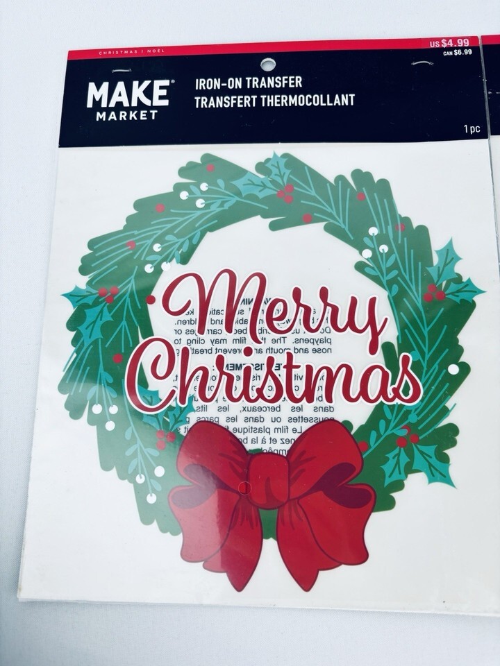 Lot 2 Christmas Iron-on Transfers -Snowman & Wreath - DIY Crafts - Hugs Merry