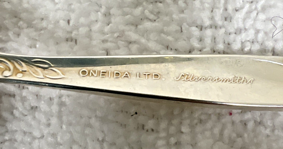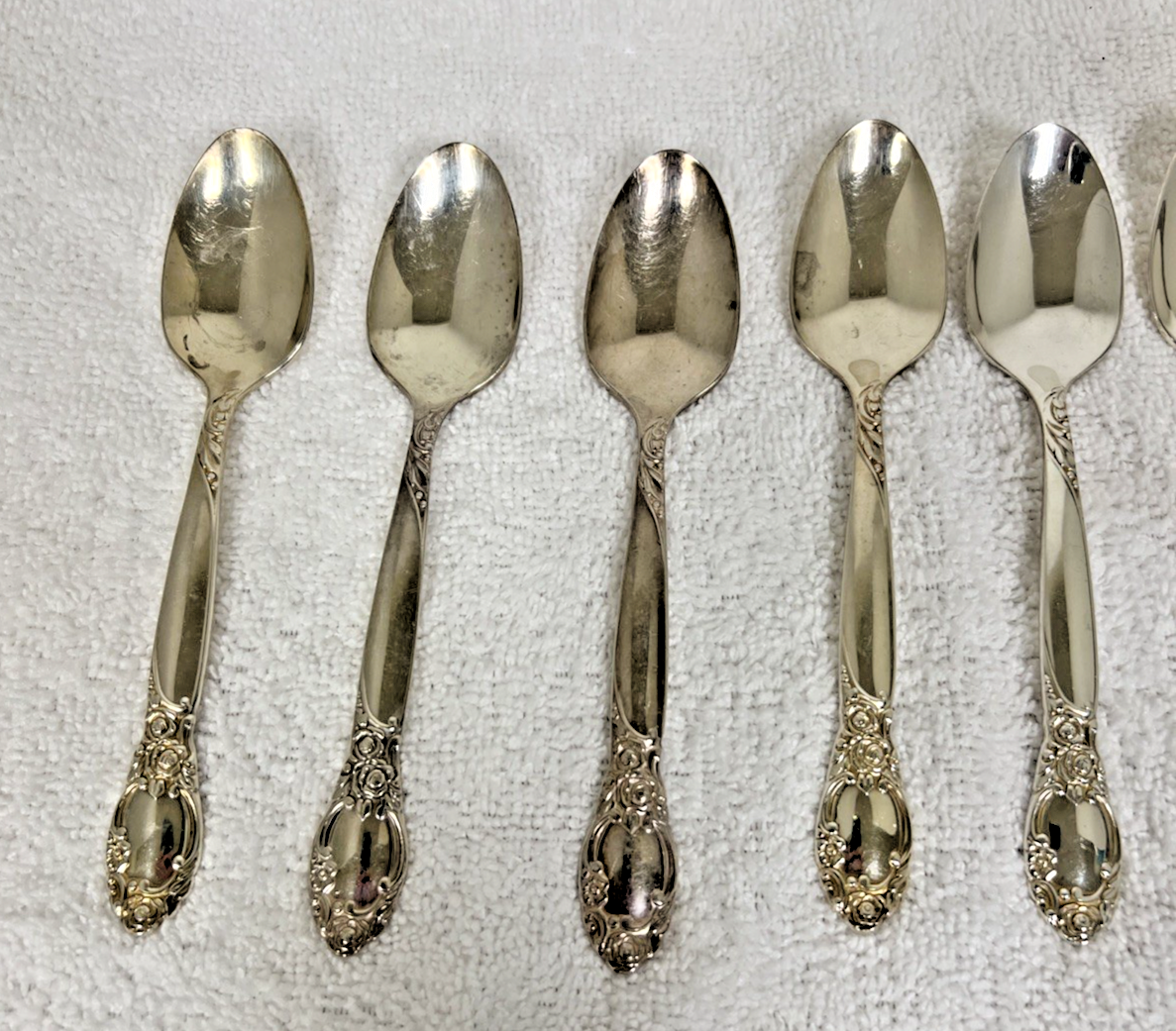 8 Plus One Vintage Oneida Ballard Country Lane Silver Plate Teaspoons 6 1/8". 9 total teaspoons floral Ballard Country Lane pattern measure approx. 6 1/8" long, signs of use - surface scratches, no damage, good used condition, no monogram, might need cleaning. See pictures.
