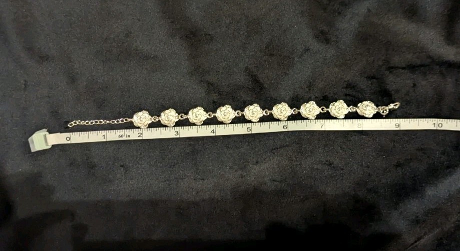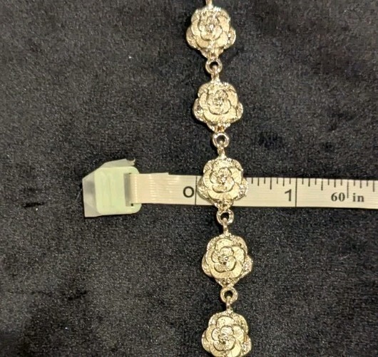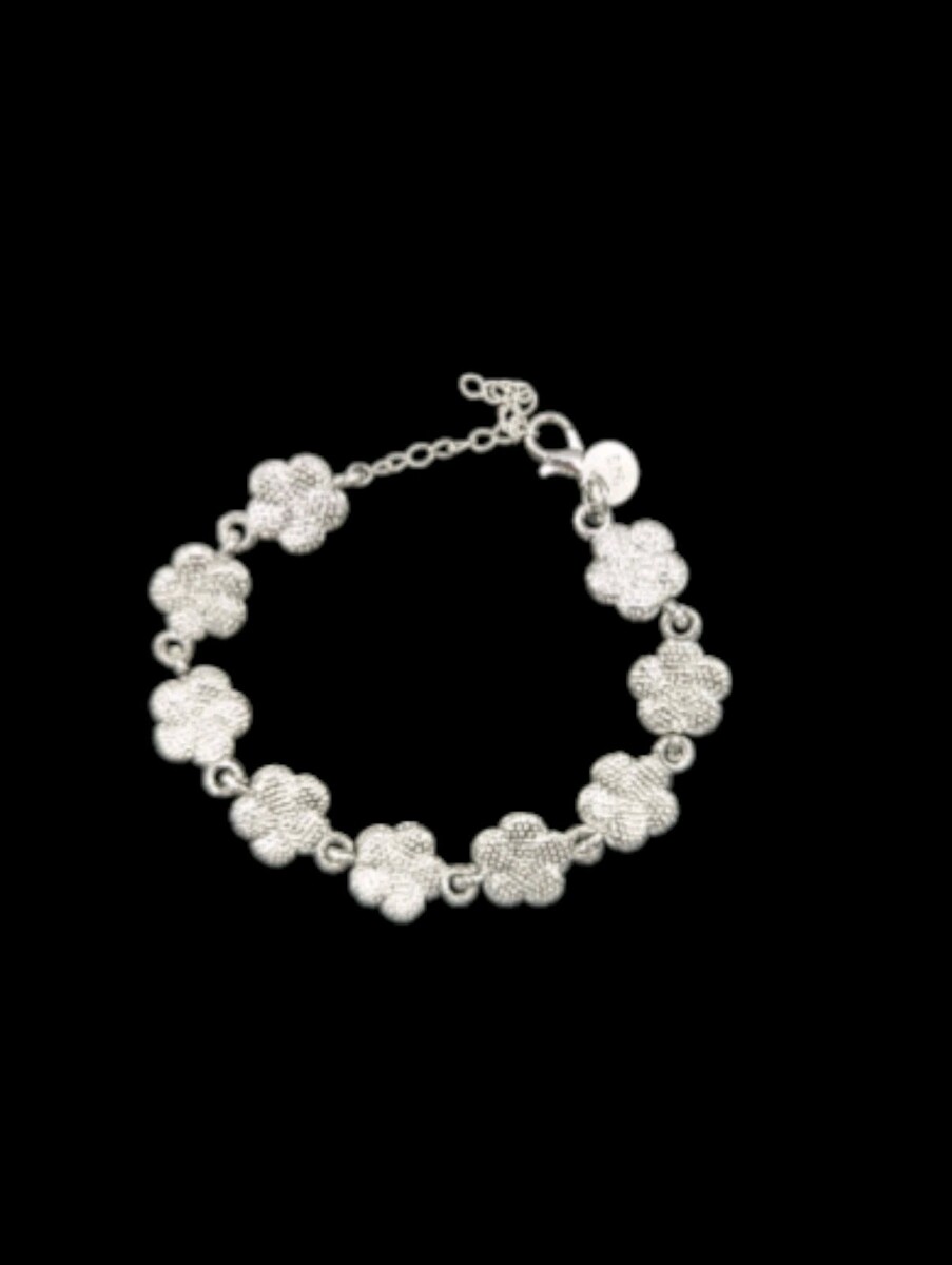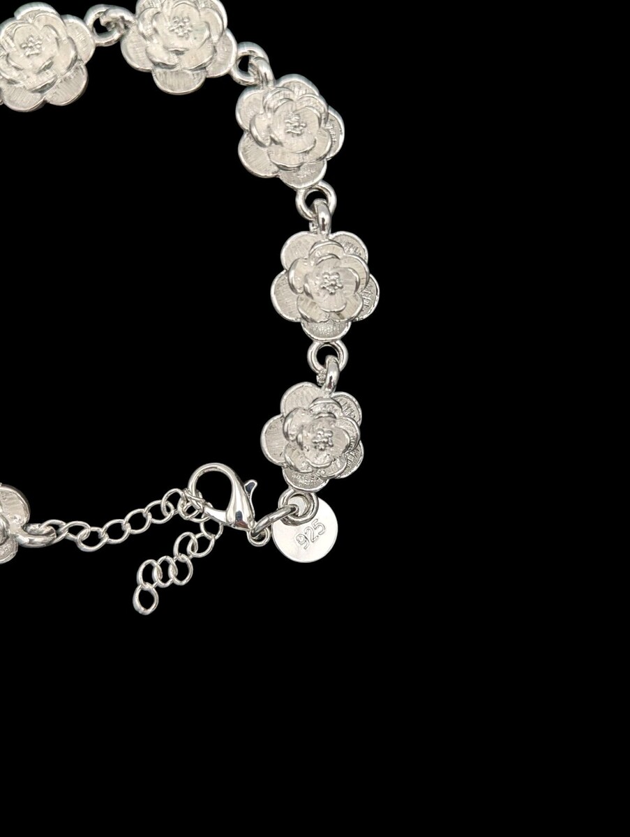 This elegant silver bracelet features beautifully crafted floral designs, perfect for adding a touch of sophistication to any outfit.
