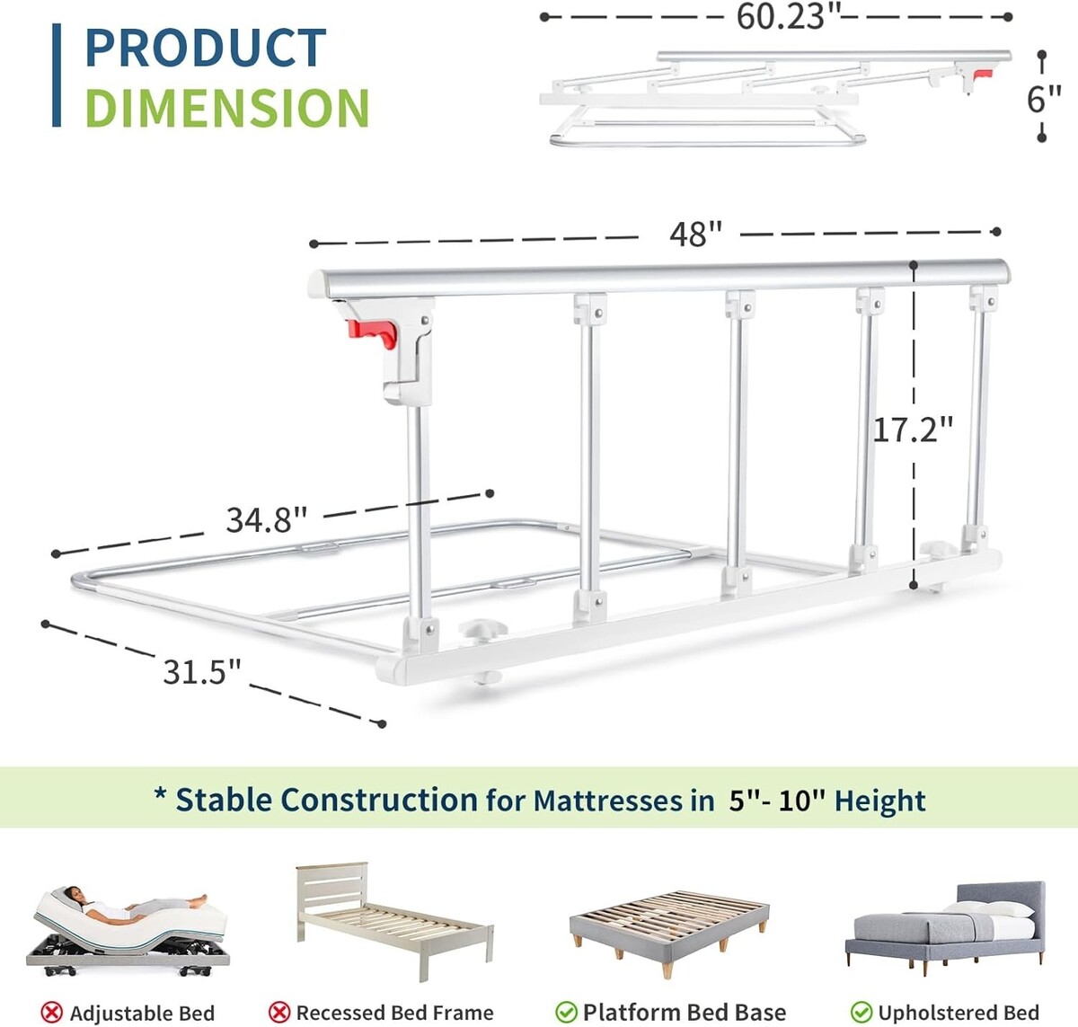 Please note: Foldable bed rail fits mattresses between 5-10 inches thick. Not suitable for adjustable beds. Please measure the thickness of the mattress before purchasing.