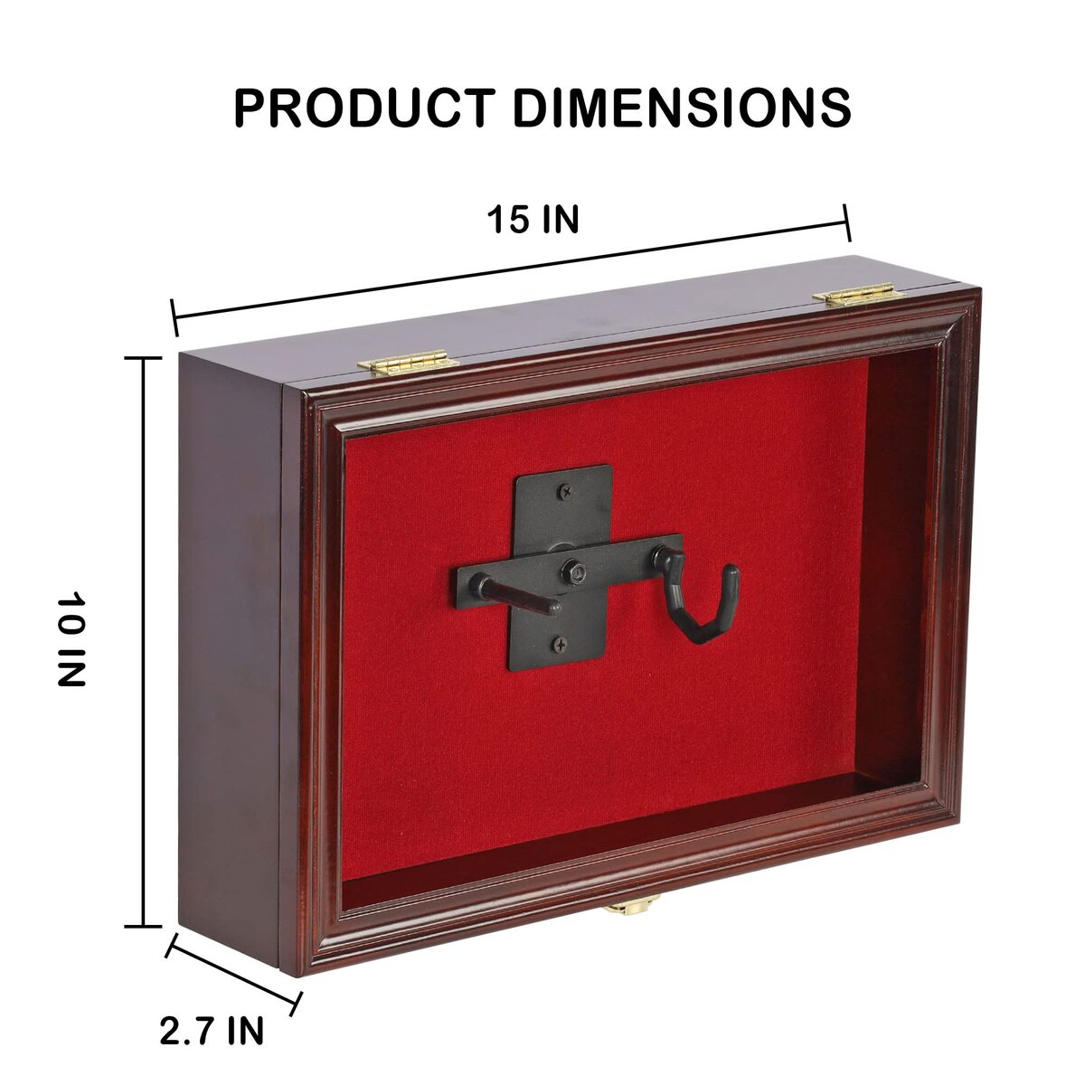 BEAUTIFUL AND SAFE: Great appearance and red velvet background creates a nice contrast for the display; The display case is hand crafted from solid wood. This has lockable door with key to access to prevent inquisitive hands.