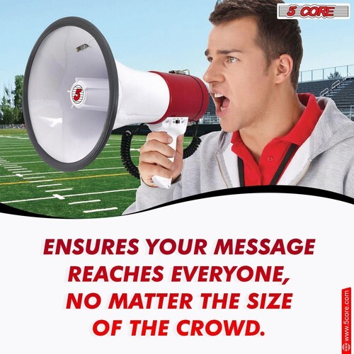 5 Core professional megaphone, designed to make your voice heard with clarity and precision! Available in sleek white and red color, it delivers a robust 50W of power, ensuring your message carries across any crowd. Easily adjust the volume to suit your needs and record up to 16 seconds of your speech for repeated playback.
