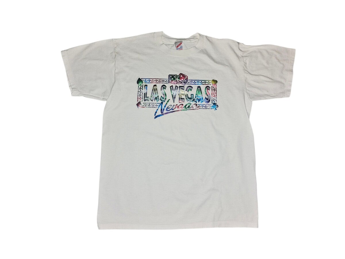 This vintage Jerzees Las Vegas metallic multicolor bubble print single stitch t-shirt in size L features a graphic print with a crew neckline and short sleeves. Made of cotton knit fabric, this t-shirt is machine washable and designed for a regular fit. The shirt showcases glitter accents, a logo, and has a USA theme, making it suitable for all seasons including summer, fall, and spring. Perfect for both men and women, this unique t-shirt is a statement piece that combines retro style with a touch of sparkle.