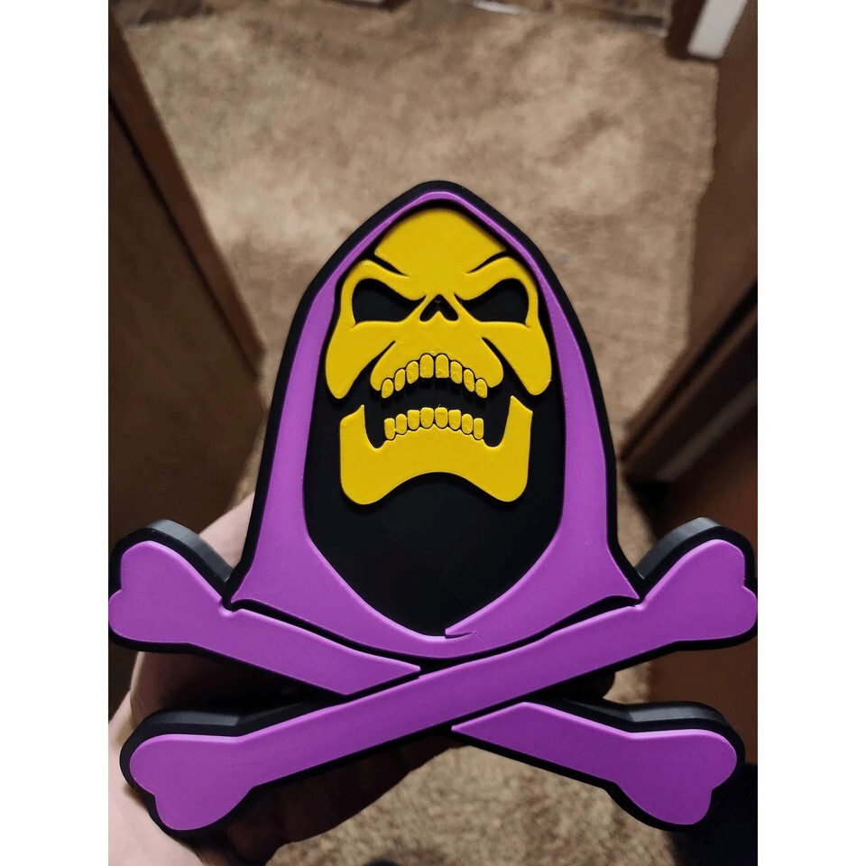 Showcase your allegiance to the lord of Snake Mountain with this iconic Skeletor emblem. Crafted from durable PVC material, this piece features a detailed, three-dimensional design of Skeletor's classic skull and crossbones logo. The vibrant purple hood and yellow skull stand out against the black background, capturing the villain's signature look. This is a perfect collectible for any Masters of the Universe or He-Man fan.