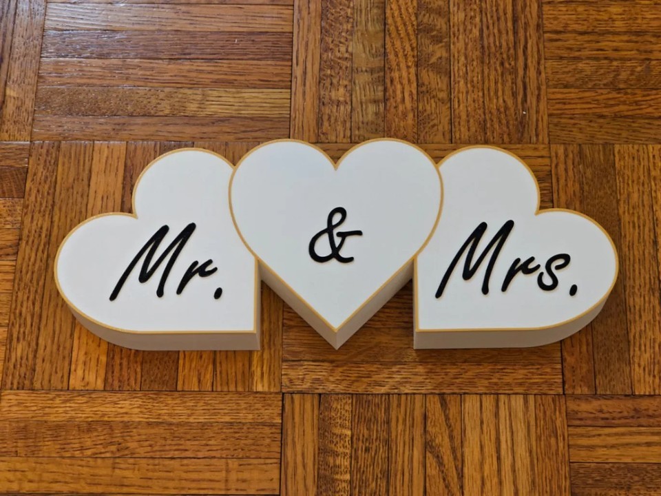Celebrate your special day with this charming Mr. Mrs. heart-shaped sign set. This decorative piece features three separate freestanding wooden blocks that spell out "Mr. Mrs." in an elegant black script. The sign features a light-colored face with contrasting natural wood-colored edges for a modern rustic aesthetic. It's the perfect centerpiece for a wedding sweetheart table, a lovely bridal shower gift, or a romantic accent for your home decor.