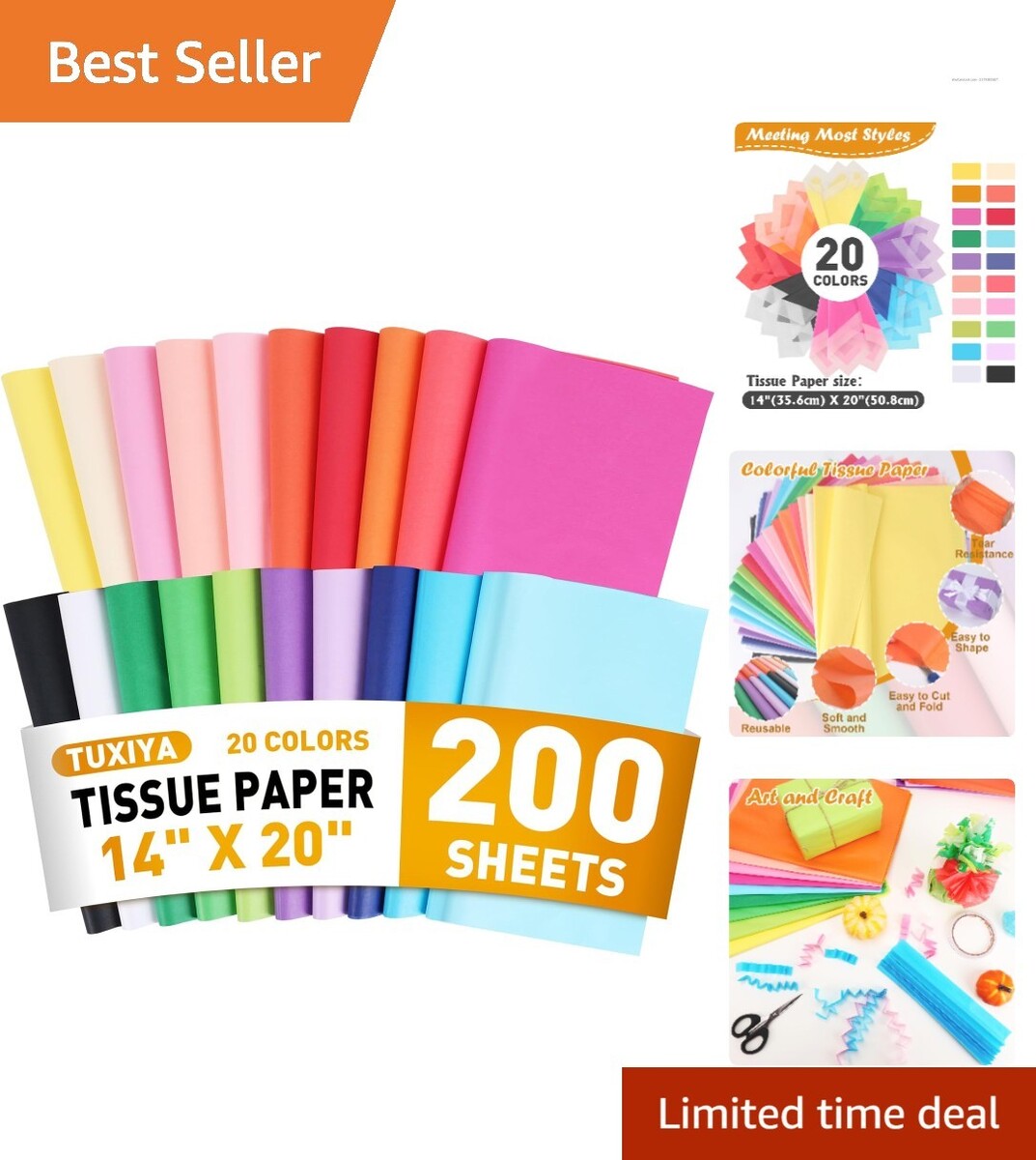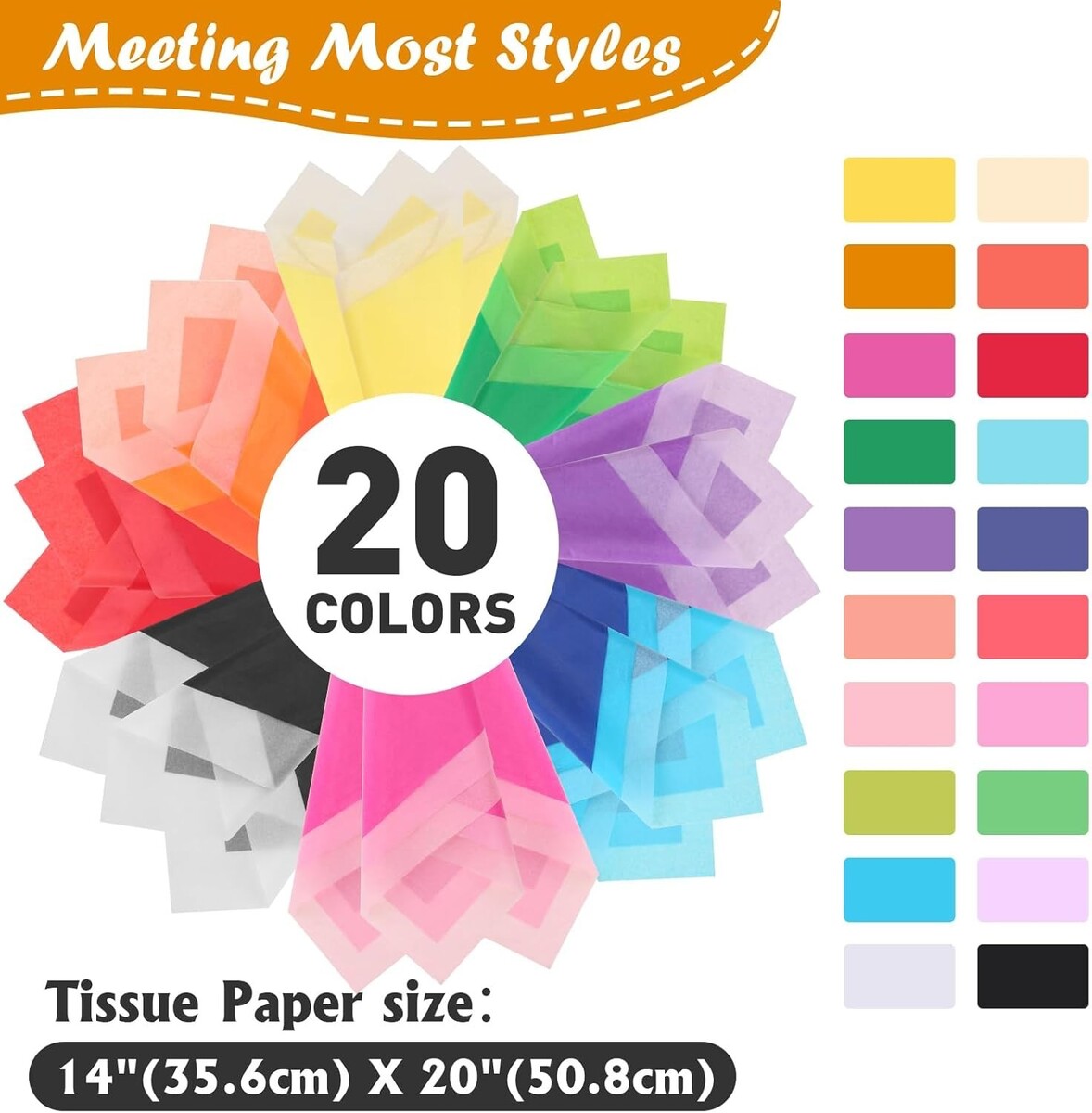 This colorful tissue paper provides 20 classic colors, with 10 pieces of each. Colors include: