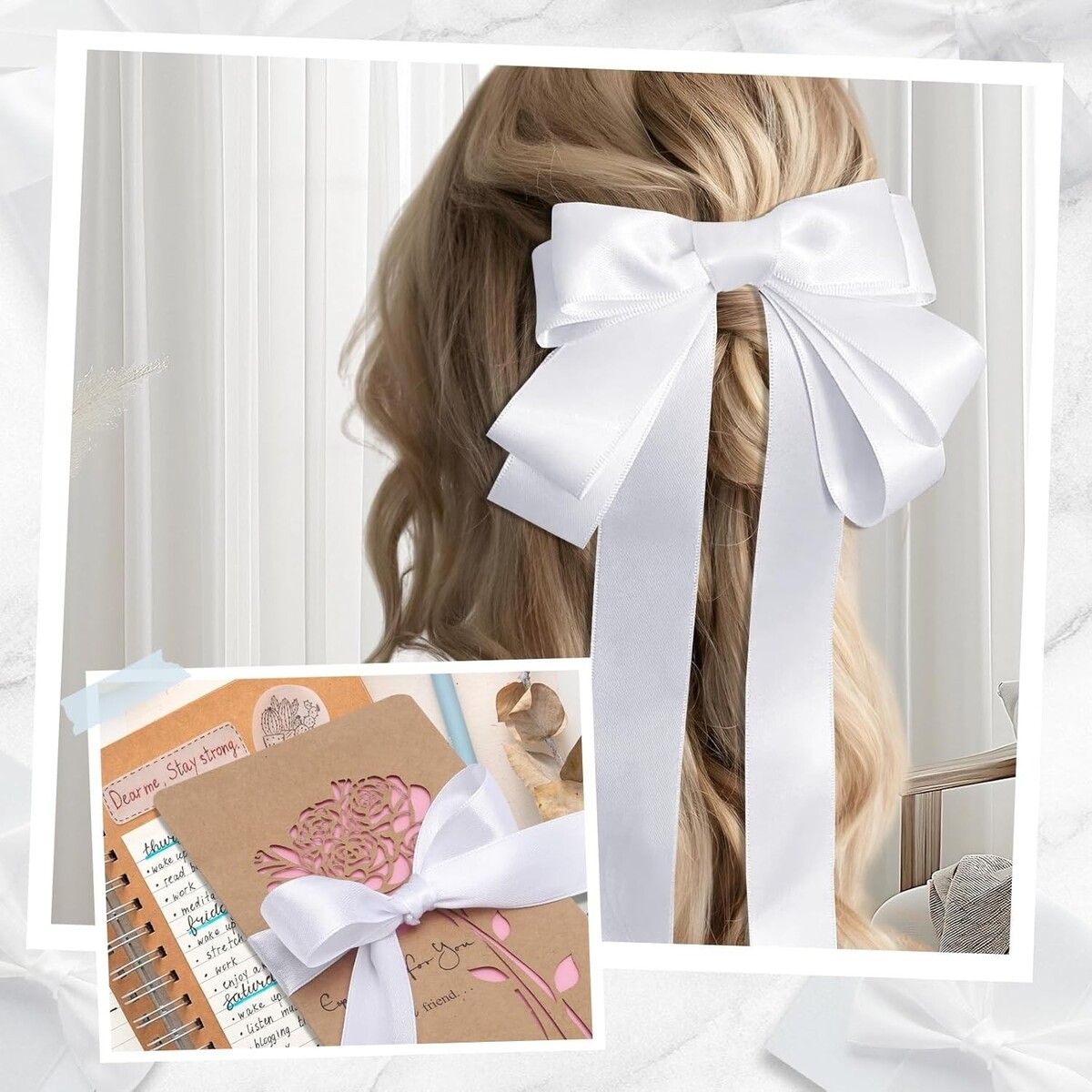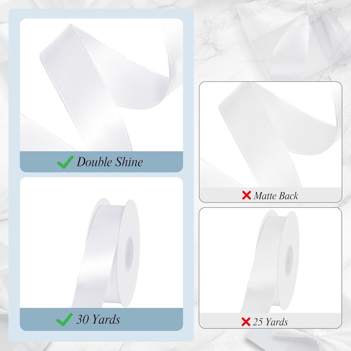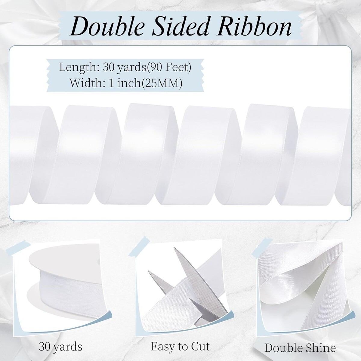 Elevate your gifting and crafting experience with our luxurious white satin ribbon. Crafted for those who appreciate elegance, its double-faced design ensures beauty from any angle, while its ample length gives you the freedom to get creative. From exquisite wedding decor to charming holiday gifts, this versatile ribbon is your go-to accessory for all occasions.