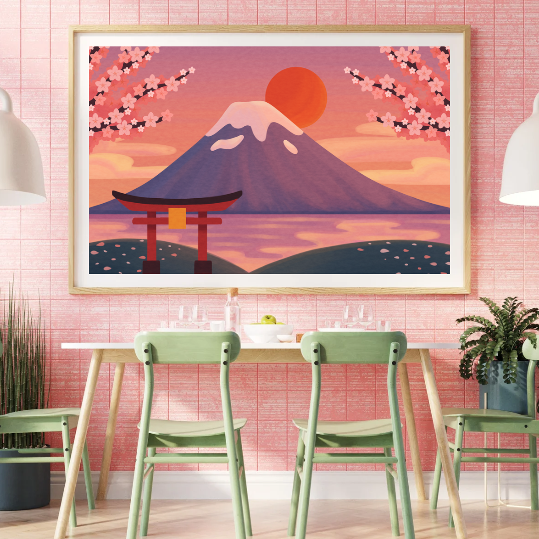 Dawn By Mount Fuji captures the quiet magic of a new day unfolding over one of Japan’s most iconic landmarks. It’s not just a scenic view—it’s a moment of stillness, where the soft light of dawn gently touches the snow-capped peak, the cherry blossoms, and the torii gate, all symbols of tradition and renewal. This artwork reflects the feeling of hope and calm that comes with morning, reminding us that each day begins with beauty, even in its simplest form. It’s about appreciating the quiet power of nature and the peaceful rhythm of life.