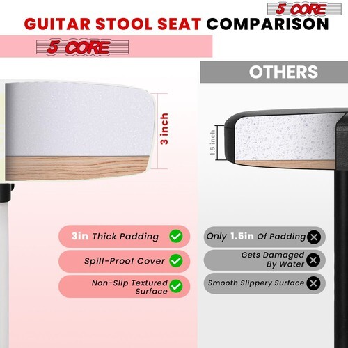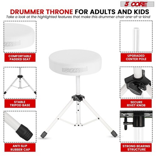 Experience unmatched performance with the 5 Core drum throne. Its 3 inch thick, 12 inch wide padded seat provides lasting comfort for long drumming sessions. This adjustable drum throne seat ranges from 17 to 24 inch, ensuring perfect playing position. The professional drum throne supports up to 330 lbs, making it ideal for both adults and kids.