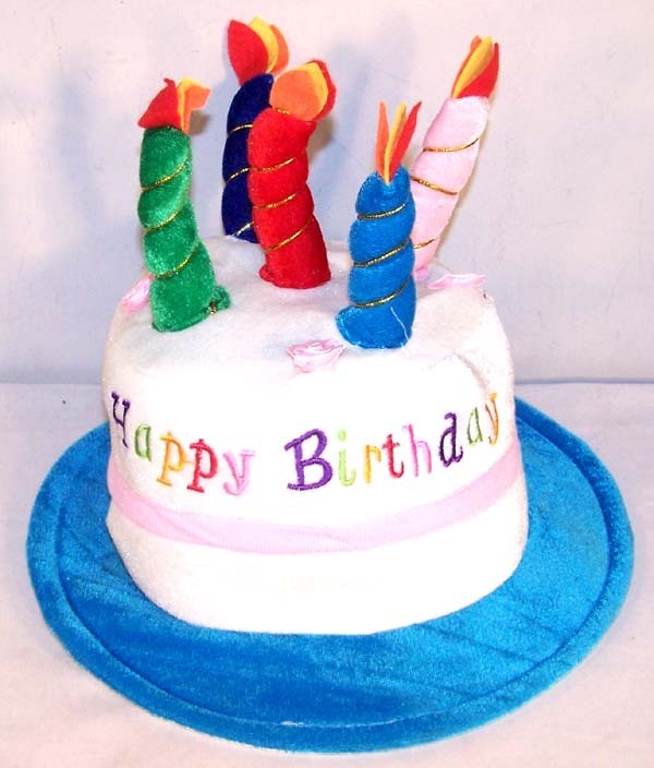 HAPPY BIRTHDAY CAKE BLUE PARTY HAT plush novelty cap party supplies candles new
