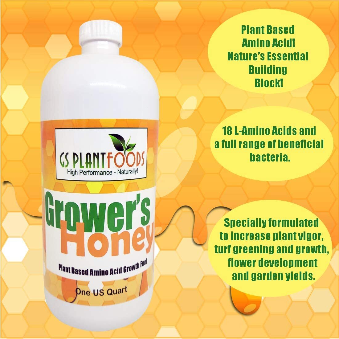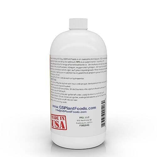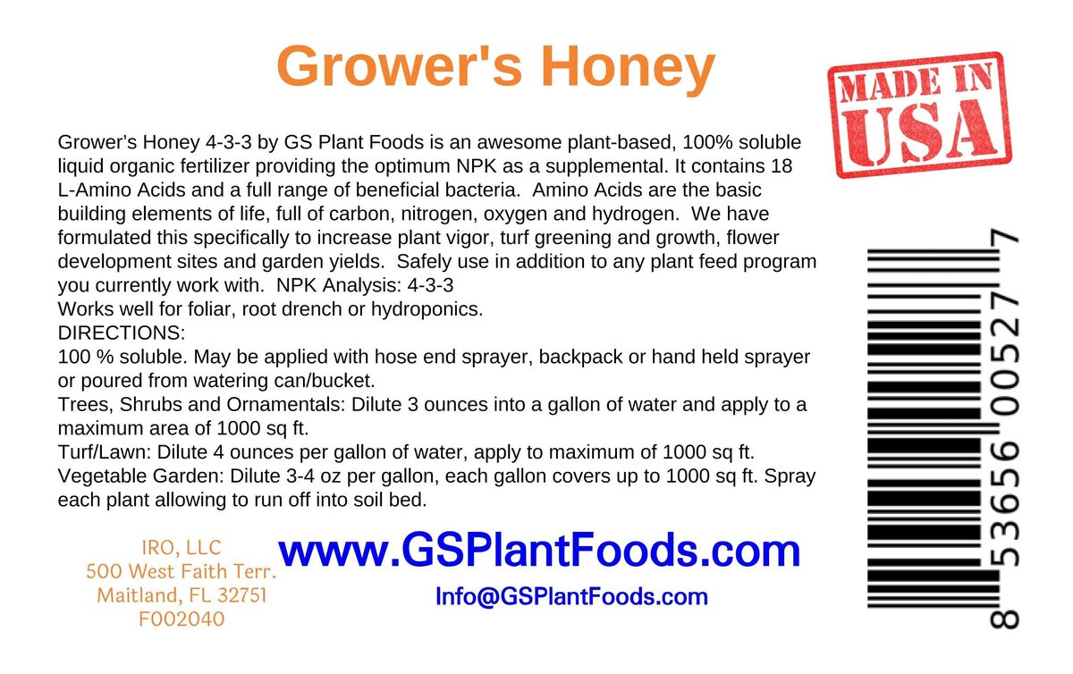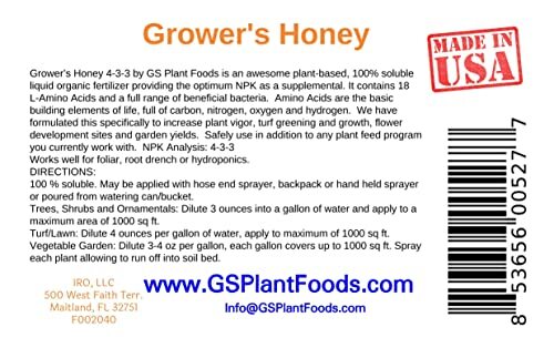 Grower?s Honey Plant Based Liquid Fertilizer by GS Plant Foods- Organic Plant Food for Huge Vegetative Growth (1 Quart) - Liquid Fertilizer for Vegetables, Bigger Flowers and Jumbo Fruits