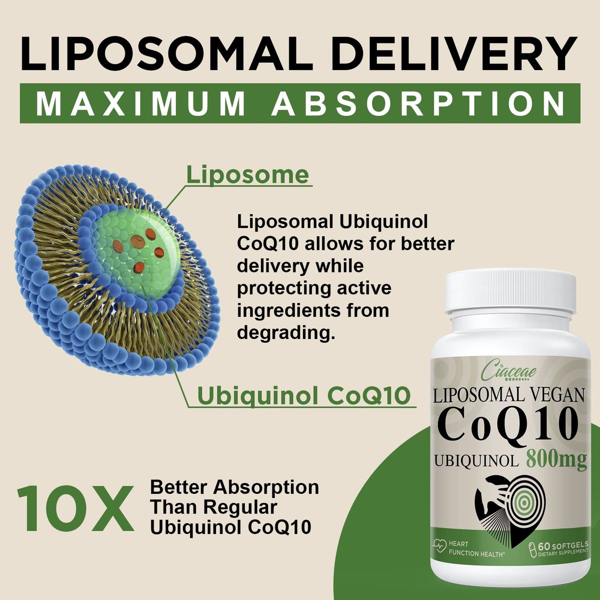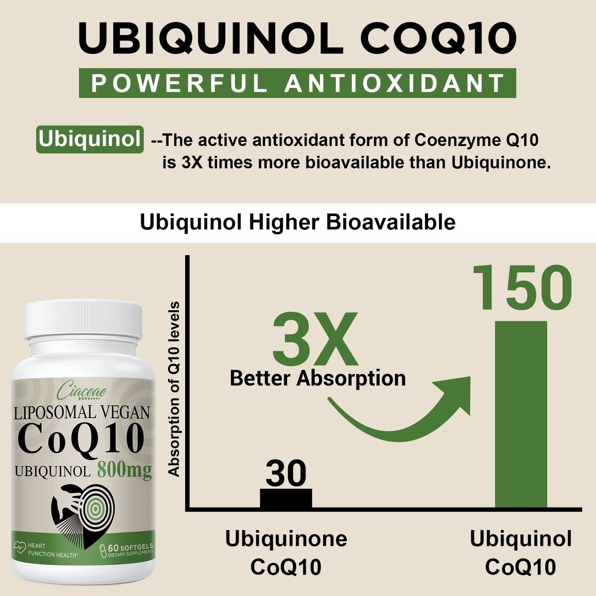 PURE CoQ10 800 MG SOFTGELS: Each softgel contains 800mg pure CoQ10 and features double potency co q10, unlike normal coq10 100 mg; 200 mg; 300 mg; 400 mg; 600 mg, Ciaceae coq10 800mg maximizes and restores natural CoQ10 to ideal levels,POWERFUL ACTIVE UBIQUINOL ANTIOXIDANT: Ubiquinol is the preferred form of Coenzyme Q10 (CoQ10). The active form of ubiquinol is 3X times more bioavailable than Ubiquinone which is more easily absorbed and utilized by the body. Save Your Money,10X HIGH ABSORPTION WITH LIPOSOMAL: Liposomal CoQ10 is a form of Coenzyme Q10 (CoQ10) that has been encapsulated in liposomes, this can help ensure that the CoQ10 is delivered to the cells so that you can win more than 99% absorption rate, up to 10x,COQ10 FOR FERTILITY: Co-Q10 levels may naturally decline up to 65% after age 20. For women over the age of 35, it may be helpful to take 400mg a day of CoQ10(CoenzymeQ10), which has been shown to help with egg quality in women over 35 years, 800 mg is enough for women's fertility,TRUSTED BRABD: 60 vegetarian softgels, Liposomal CoQ10 Supplements with 100% natural indigents, third-party tested! No Artificial Flavors, No Gluten, No Soy, Wheat free, designed for nonvegetarians or vegans