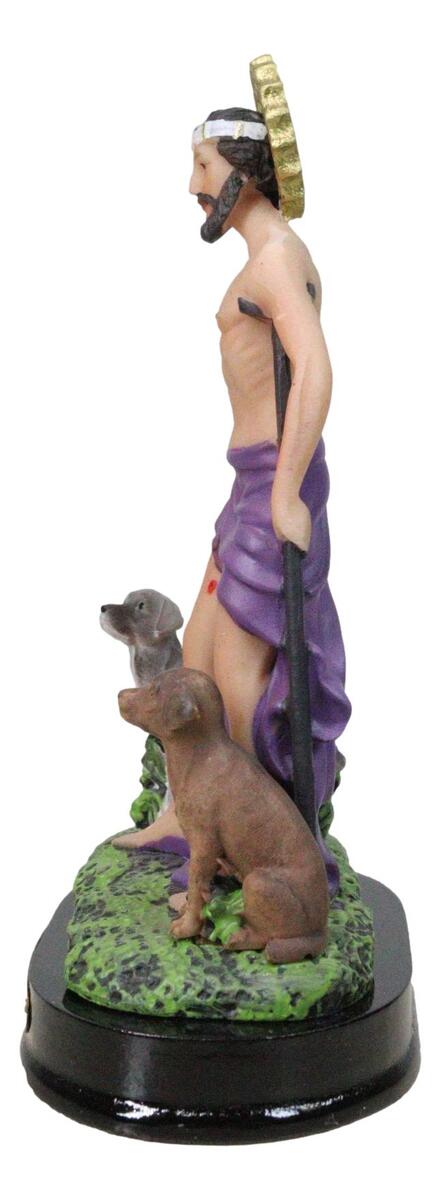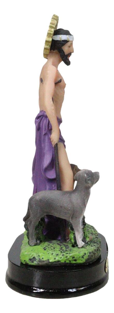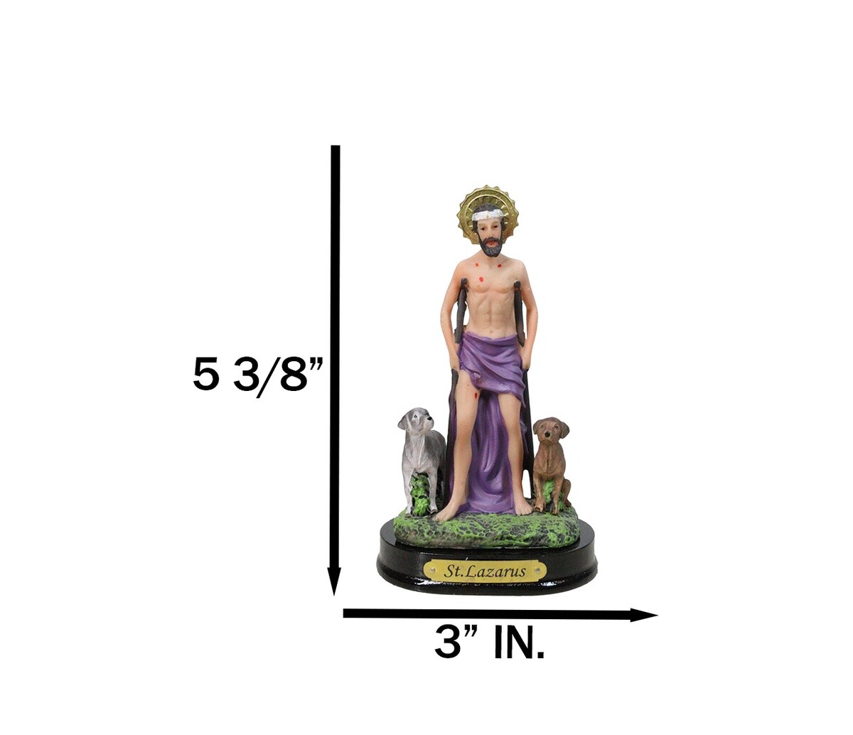 ? Honor the powerful intercession of Saint Lazarus with this beautifully crafted figurine, depicting the beloved saint accompanied by faithful dogs and adorned with a radiant sun border medal symbolizing divine light and hope. Rich in detail and reverent artistry, this devotional piece stands upon a sturdy base accented with an elegant brass name plate for a distinguished finish.