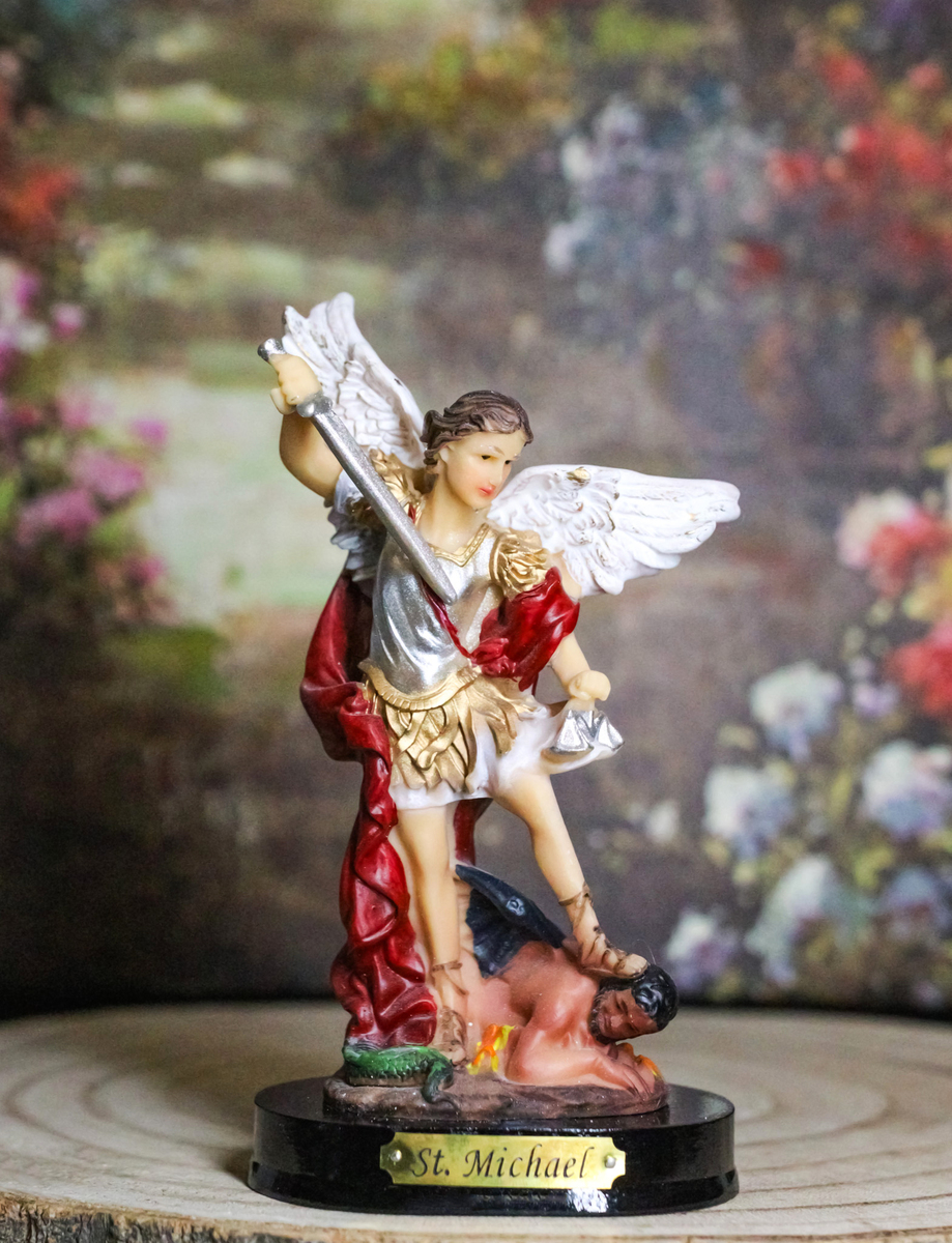 ? St. Michael's name means "Who is like unto God?" Patron of the Sacrament of the Holy Eucharist: He is Leader of the Armies of Heaven. As a warrior he defends not only our souls against the infernal enemy when we call on him, but he also defends Our Lord, Who is helpless in the Blessed Sacrament. Own this marvelous figurine of the archangel Michael, the patron saint of the Holy Eucharist Sacrament and the ultimate protector of men.