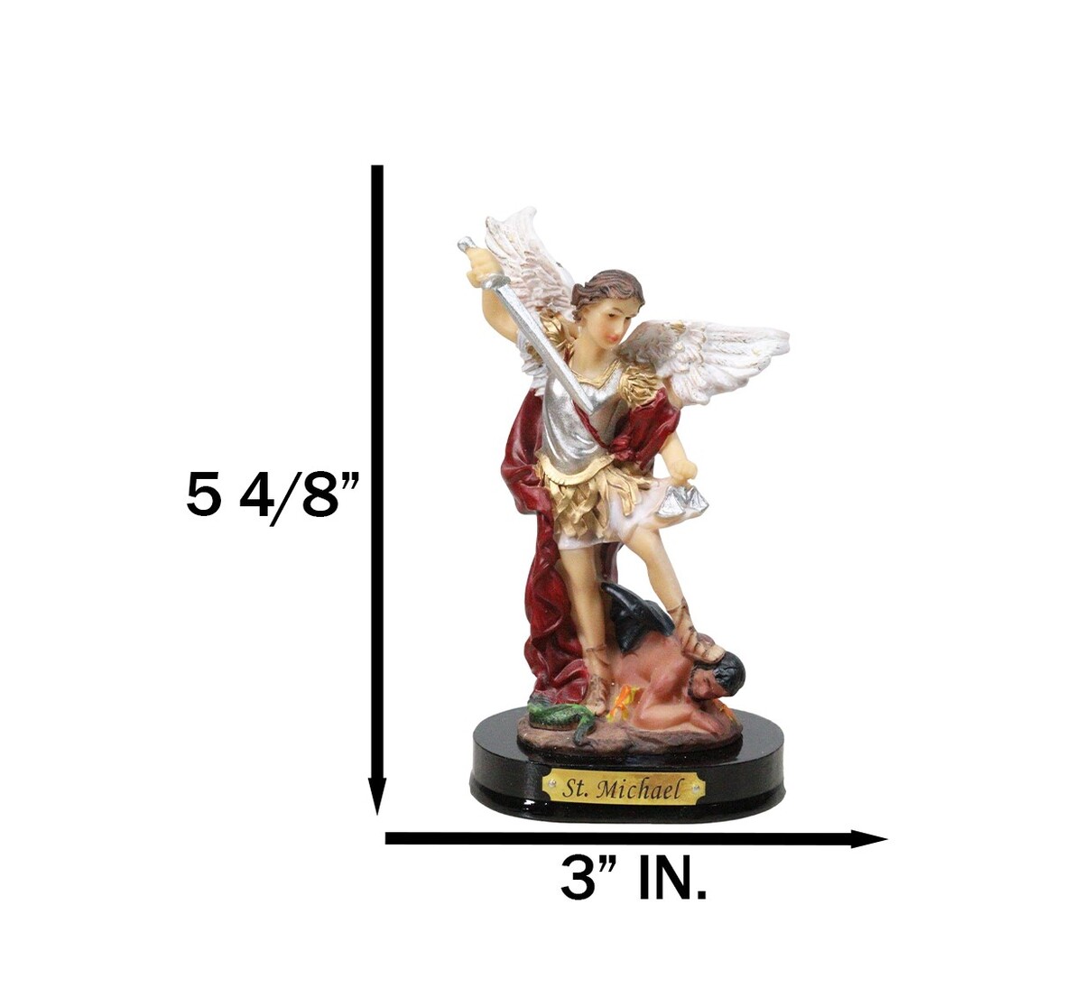 ? This Saint Michael The Archangel Figurine measures 5.5" tall, 3" wide and 2" deep approximately. It weighs approximately 5 ounces.