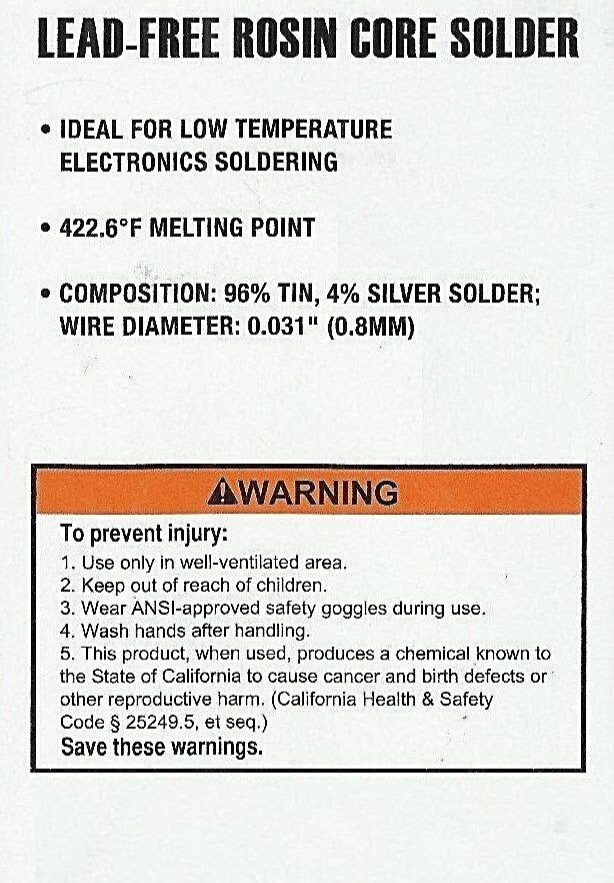FOR SALE IS ONE (1) NEW TUBE OF LEAD FREE ROSIN CORE SOLDER FOR ELECTRICAL USE 0.5 ounce (1/2 ounce = 14 grams), 0.031" (0.8mm) diameter WIRE STRAND. LEAD FREE, ROSIN CORE, LOW TEMPERATURE (422.6 F (farenheit) = 217 celcius), THIS SOLDER IS COMPOSED OF 96% TIN AND 4% SILVER, PROVIDES INCREASED STRENGTH AND CONDUCTIVITY, ROSIN CORE BASED, SO NO FLUX IS NECESSARY. MELTING POINT IS 422.6 farenheit, MEANS FAST AND EASY TO USE, THINNER DIAMETER THAN AVERAGE SOLDER STRAND, MEANS FAST AND EASY MELTING, AND APPLICATION. THIS LEAD FREE ROSING CORE SOLDER IS IDEAL FOR SPEAKER WIRE, MOTORS, APPLIANCES, WIRING, ELECTRICAL WIRING WORK. NOT FOR PLUMBING! COMES IN CONVENIENT PULL OUT STORAGE POLY TUBE DISPENSER. YOU WILL RECEIVE ONE (1) FACTORY FRESH 1/2 ounce TUBE OF LEAD FREE ROSIN CORE SOLDER FOR ELECTRICAL USE SHIPPED BY USPS.....