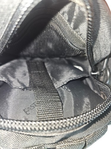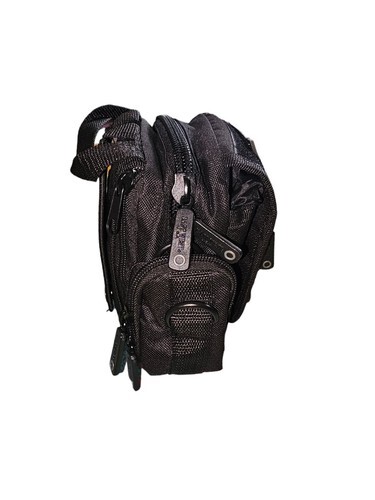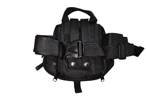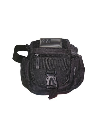 The East West USA RT527MULTI-FUNCTIONAL UTILITY PACK BLACK is a pre-owned waist pack made of polyester and nylon with a black color. It has a plastic frame and features two dividers, seven pockets, and a zip closure. The pack also has external pockets, an elastic pocket, and a hip belt. The pack has an American flag patch and is suitable for hunting. It measures 5.5" in length, 7.5" in height, and 3" in width. It is made in the United States and is a tactical, Molle pouch. Does Not include shoulder strap.