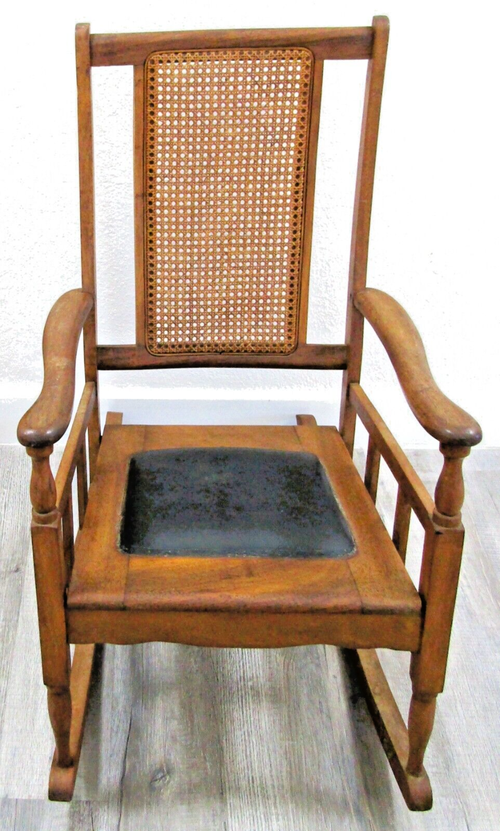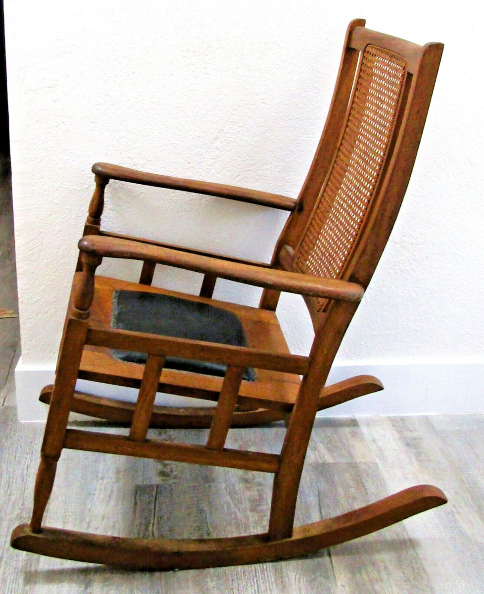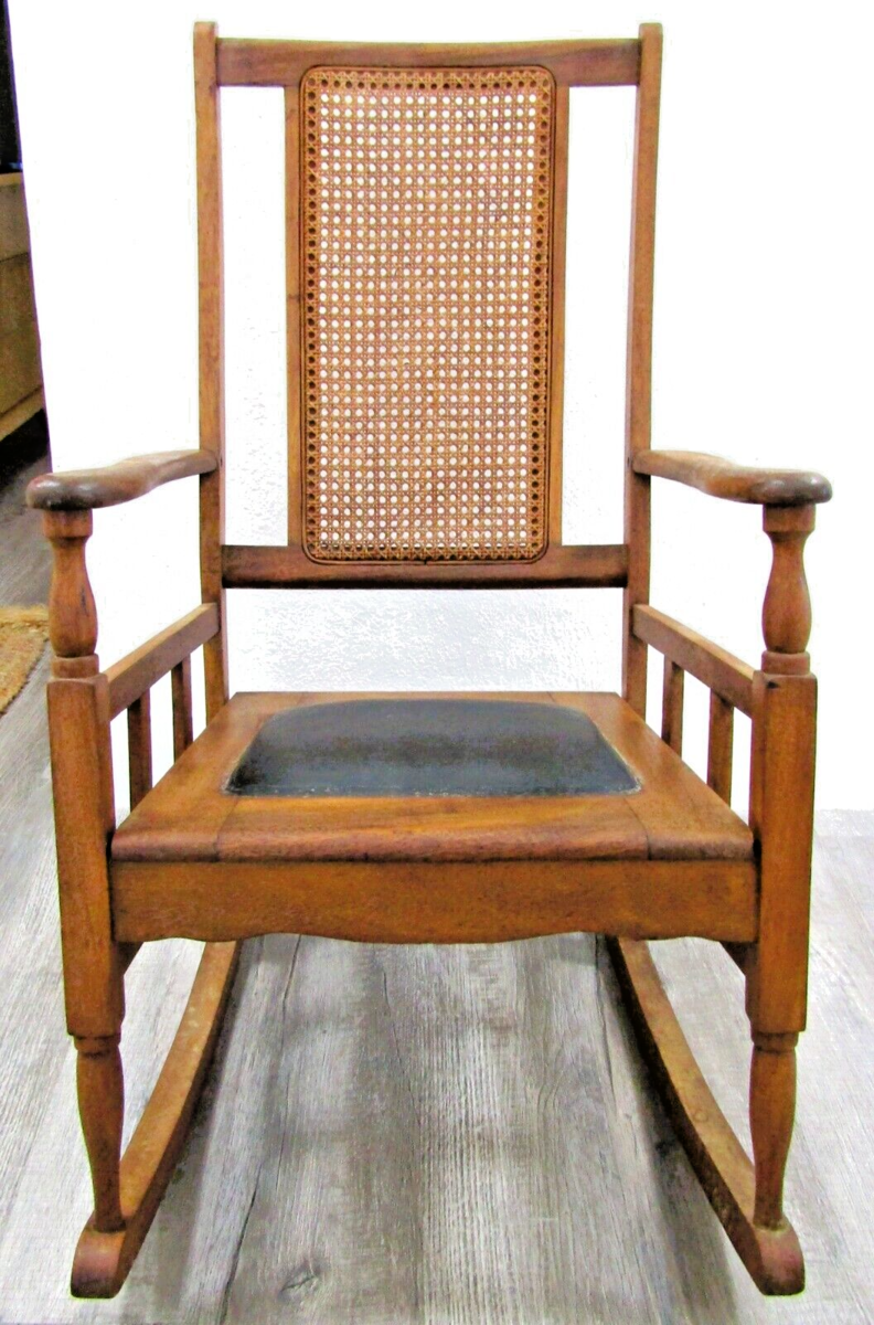 Antique Mission Style Oak Cane Back Black Leather Seat Rocking Chair