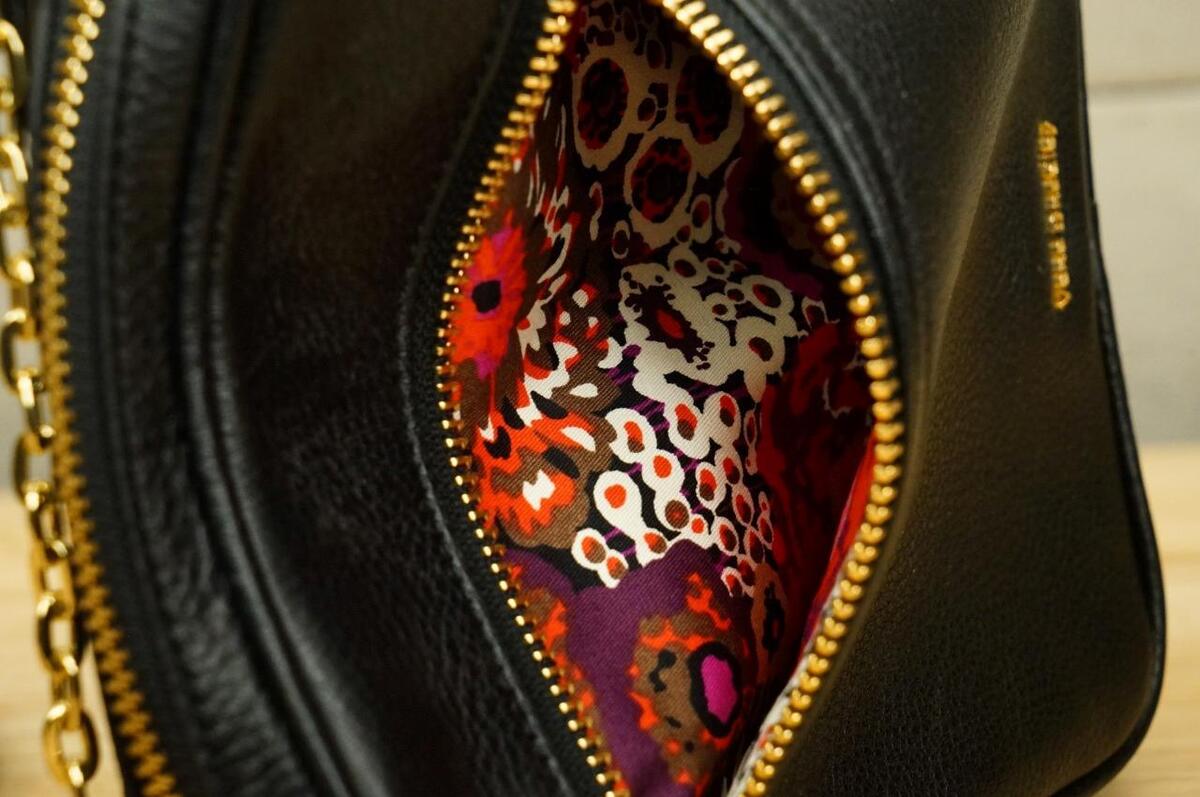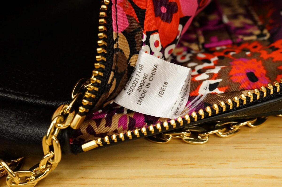 Designer Purse VERA BRADLEY Elena Black Pebbled Leather Crossbody Bag. Body measures 7" by 7" - bright pattern fabric lining. Strap is chain and leather.
