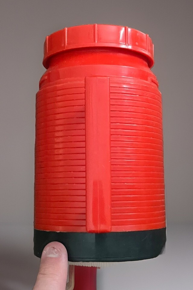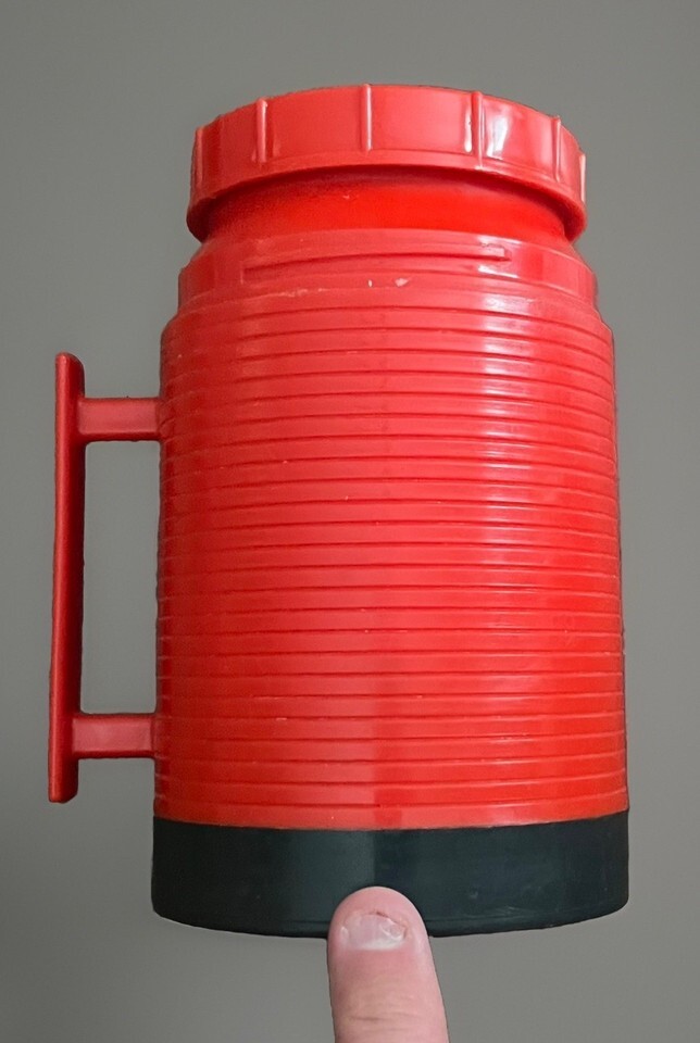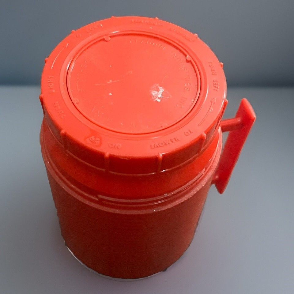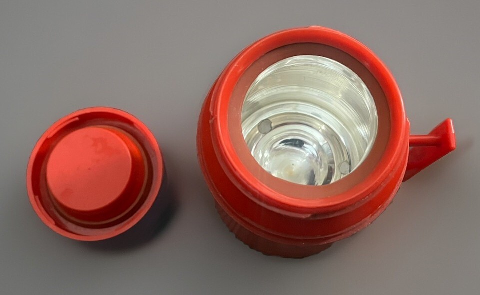 Great condition!! WORKS GREAT!!! Comes as pictured. Tiny bit of sticker residue on top lid. Excellent condition!!! Clean!! Really old Thermos!!