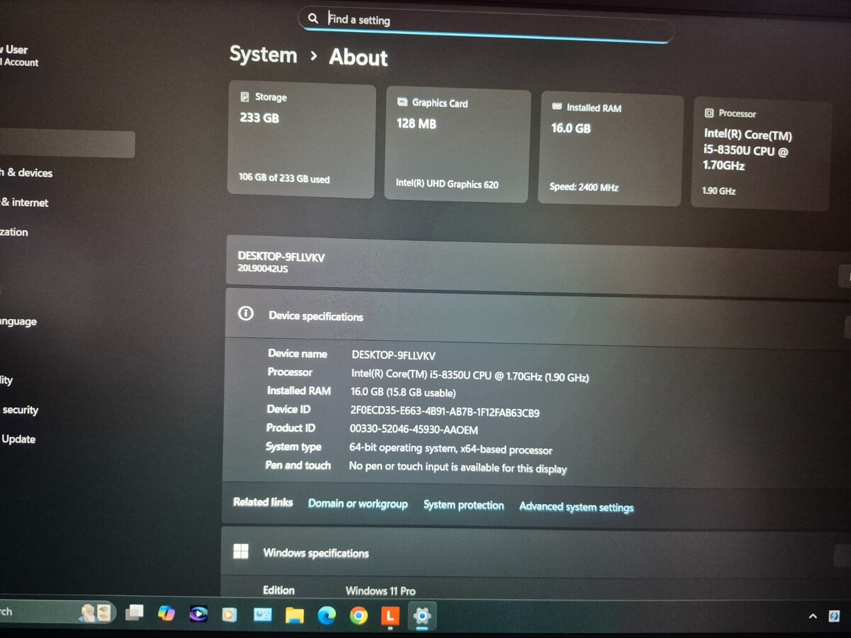 Intel Core i5 ~ 8350U @ 1.70GHz * 16GB Ram * 250 GB SSD