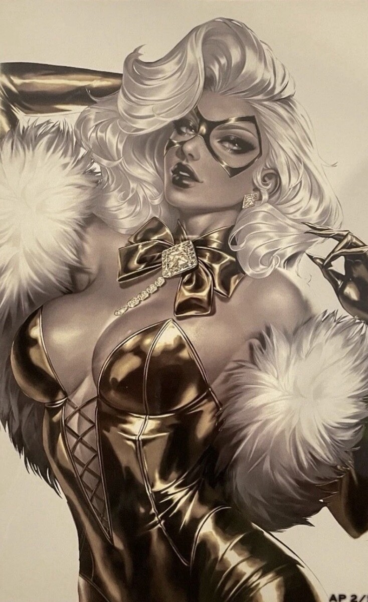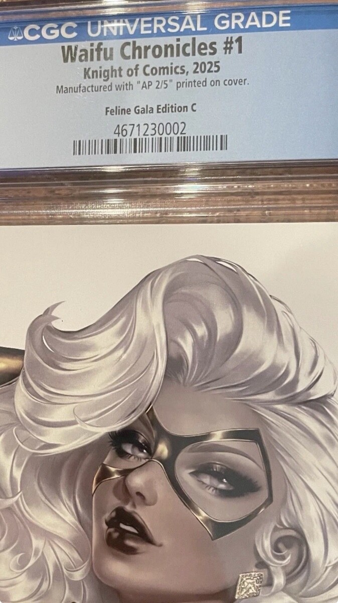 The BLACK CAT Cosplay CGC 9.8 comic book is a rare and highly sought-after variant featuring the character Black Cat (Felicia Hardy) from the Waifu Chronicles series. This limited edition issue, graded at 9.8 Near Mint/Mint by Certified Guaranty Company (CGC), is a special "RISQUE VIRGIN GOLD AP VARIANT" that was released at the Terrificon convention. Published by Knight of Comics in 2025, this modern-age comic book is a valuable addition to any collector's shelf, especially for fans of the bad girl genre.
