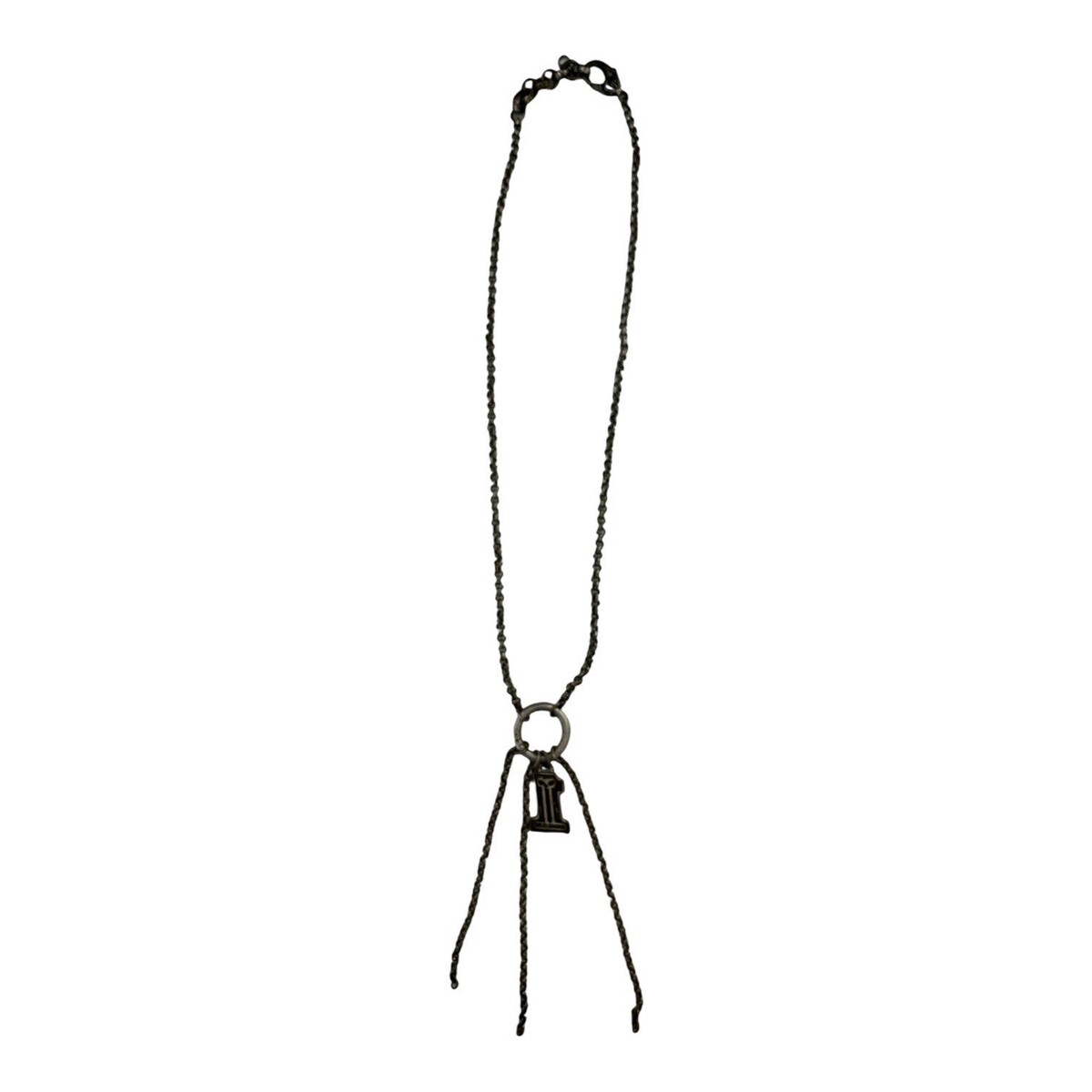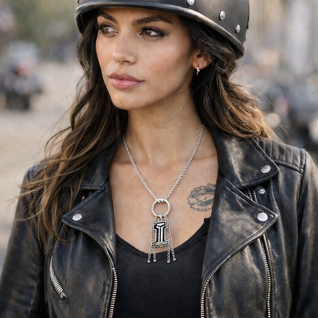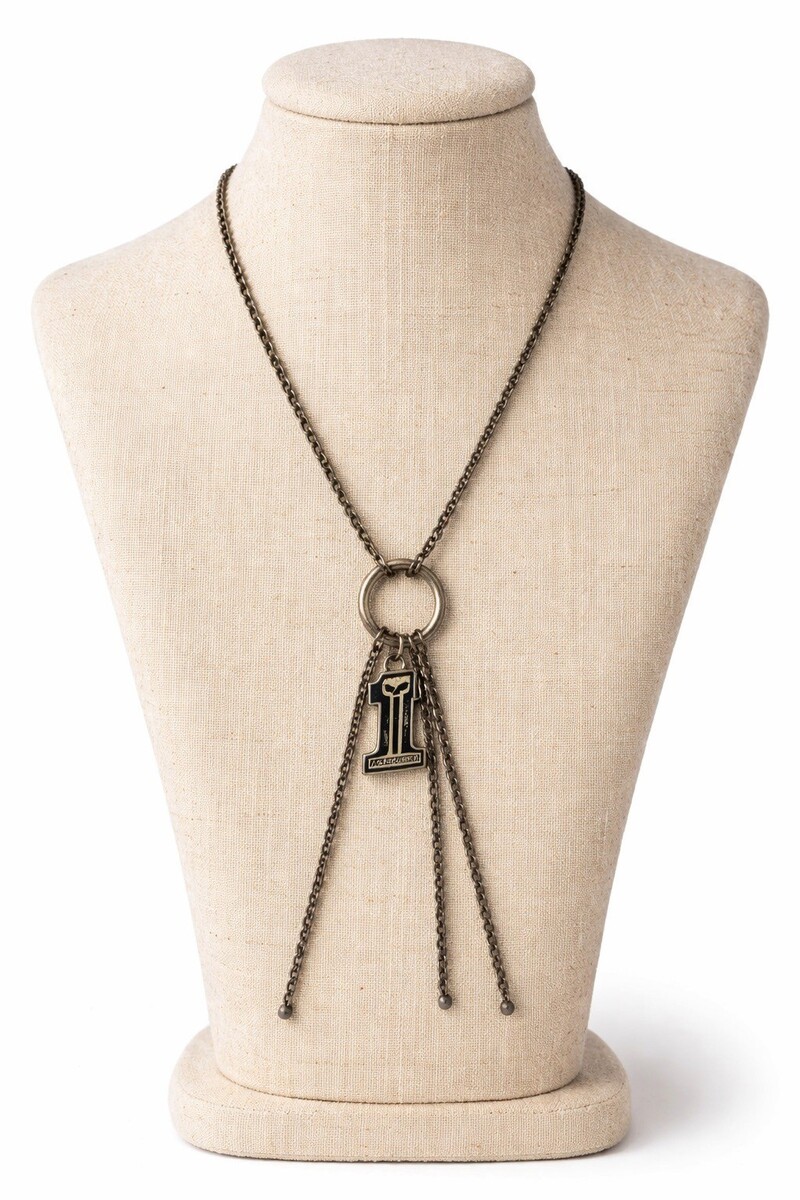 Vintage Harley-Davidson necklace featuring a dangling #1 emblem charm suspended from a circular ring connector with cascading chain tassel strands. Dark gunmetal-tone finish gives it a rugged biker aesthetic with authentic worn character. Lightweight statement piece perfect for Harley collectors, motorcycle enthusiasts, or anyone who loves bold vintage industrial-style accessories.