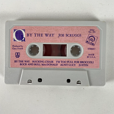 This listing is for the original audio cassette tape "By The Way" by Joe Scruggs. The recording features a collection of songs and stories, produced by Gary Powell. It is presented in a standard audio cassette format, suitable for playback on a cassette player. The tape includes tracks such as "Abracadabra," "Grandmas and Grandpas," "School Glue," "Eensy Weensy Spider," "Read A Book," "I Had A Dream," "Rocking Chair," "I'm Too Full For Broccoli," "Rock And Roll MacDonald," "Aunt Lucy," and "Justin." This stereo recording was produced by Educational Graphics Press, Inc. and carries copyright dates of 1986 and 1987. The cassette is marked with item number 391 and was made in the U.S.A. The tape features a pink label with a 'Q' logo and a "Discovering Music" graphic.