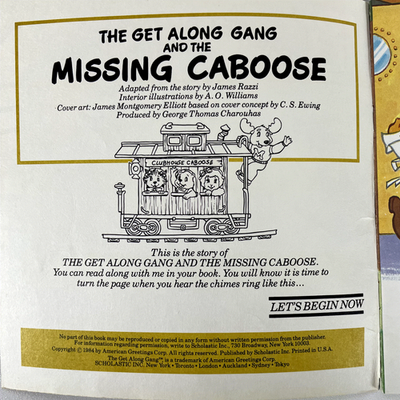 Discover "The Get Along Gang and the Missing Caboose," a delightful read-along experience presented by Buena Vista Records. This set features a single cassette tape paired with a 24-page full-color illustrated book, offering word-for-word story narration with favorite character voices and authentic sound effects to engage young listeners and readers. Adapted from the story by James Razzi, with cover art by James Montgomery Elliott and interior illustrations by A. O. Williams, this set is perfect for children learning to read.