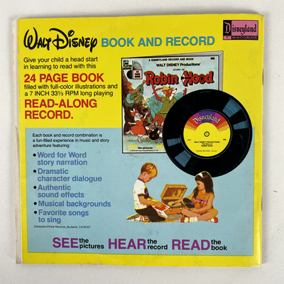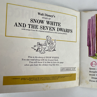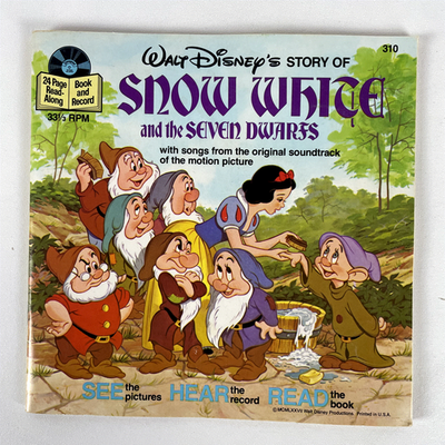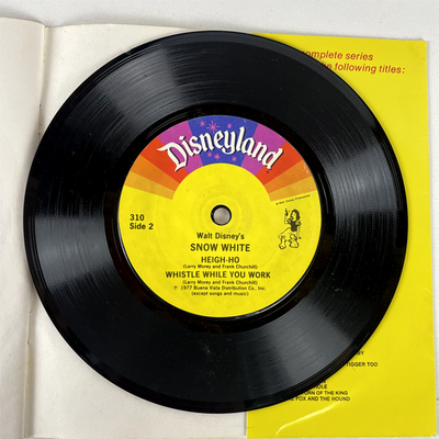 Embark on a magical journey with "Walt Disney's Story of Snow White and the Seven Dwarfs," a charming 7-inch book and record set released in 1977 by Disneyland Records. This enchanting read-along record features beloved songs and story narration from the original motion picture soundtrack, bringing the classic fairy tale to life for young listeners and collectors alike. The set includes a 24-page full-color illustrated book, allowing children to follow along with the story as they listen to the 33? RPM vinyl record.