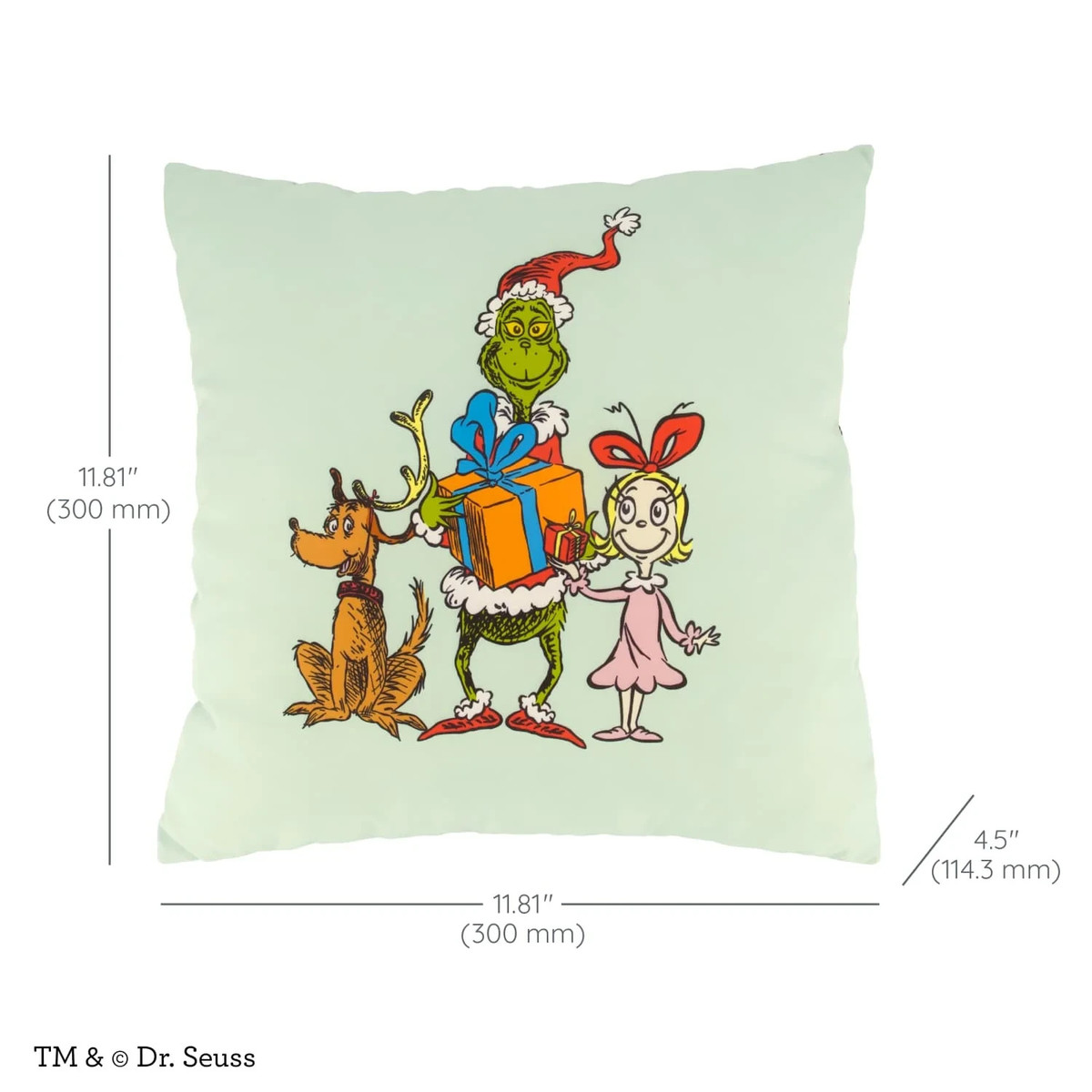 Add holiday cheer to down time and play time with the Infantino The Grinch Double-Sided Soft Pillow. One side features The Grinch with Cindy-Lou Who and Max, while the other shows a festive pattern of The Grinch in his Santa hat. Made with soft, cozy fabric, this 11.81" x 11.81" pillow is just the right size for toddlers during play time, story time, or travel. Lightweight and easy to pack, it brings seasonal fun wherever little ones go. A cheerful accent and a thoughtful holiday gift, this reversible pillow is sure to be a holiday favorite.