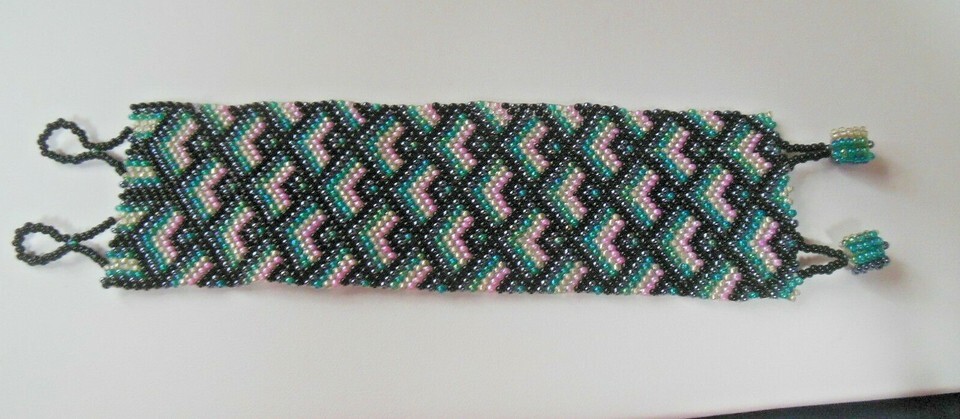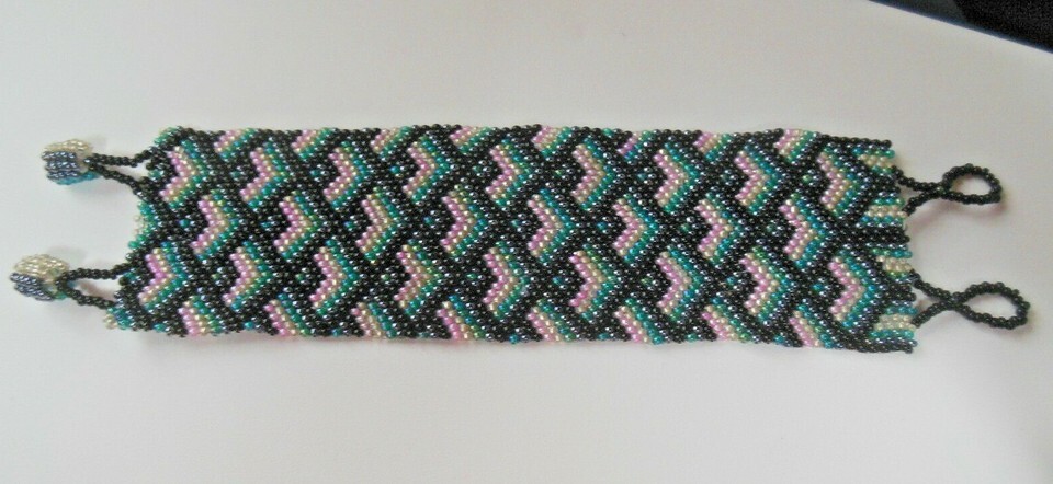 Vintage Extra Wide Woven Multi-color Seed Bead Criss-Cross Pattern Bracelet 8"