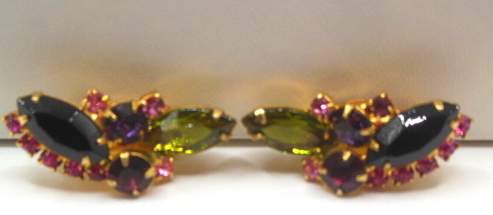 Vintage JULIANA Multi-Color Rhinestone Prong-set Clip-on Earrings 1.1/4" x 1/2"