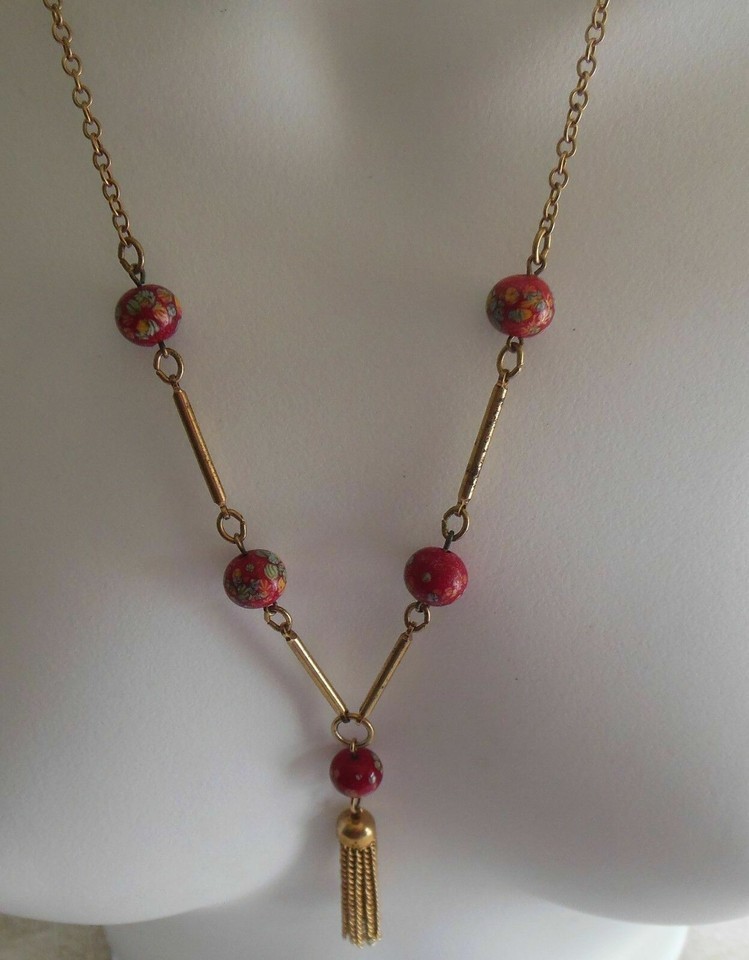 Sarah Coventry Floral Painted Red Glass Bead Tassel Pendant Necklace