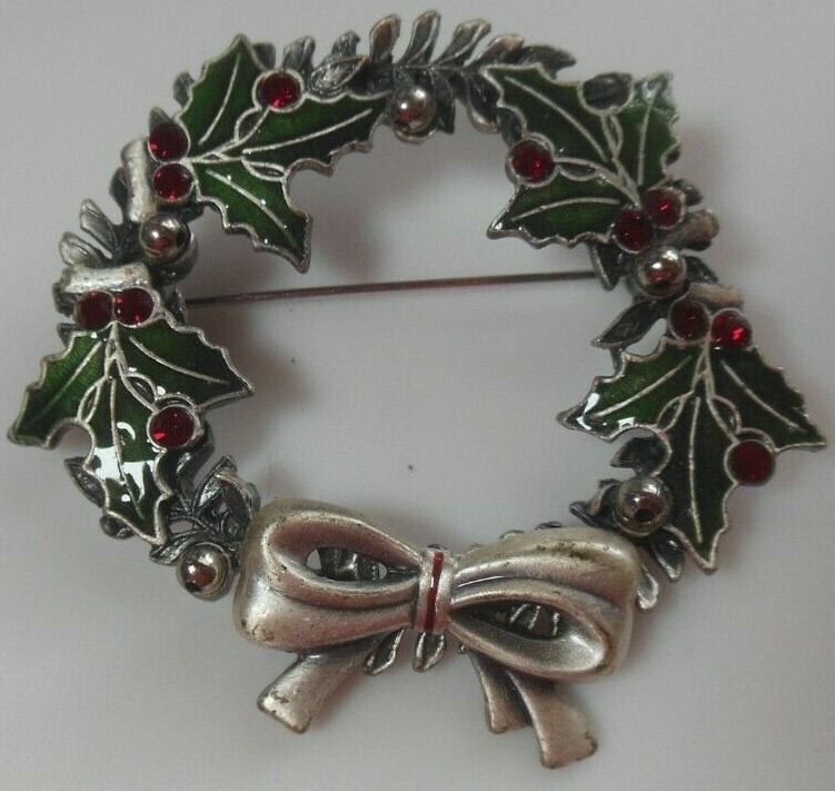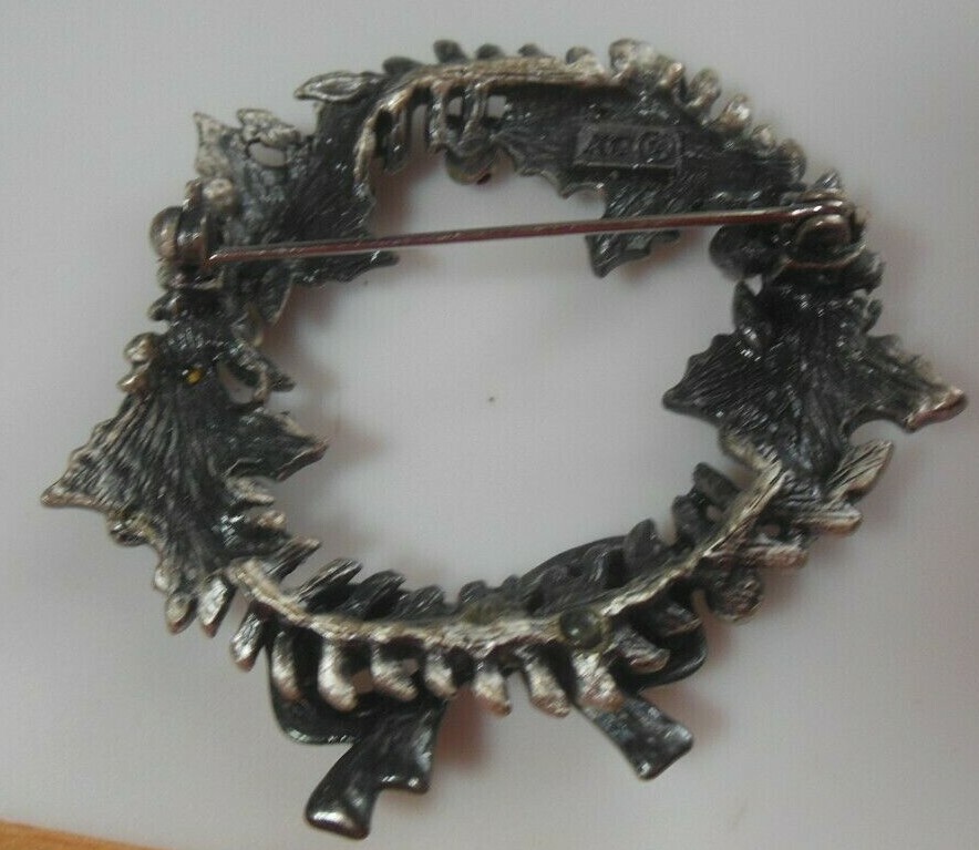 Signed KC Silver-tone Enamel Rhinestone Christmas Holy Wreath Brooch/Pin