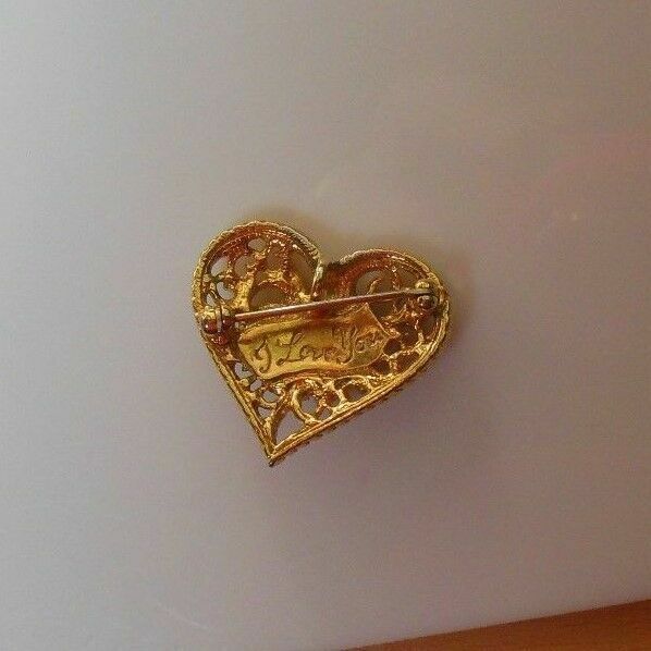 Vintage Gold-tone Enamel Filigree Heart Brooch "I Love You"