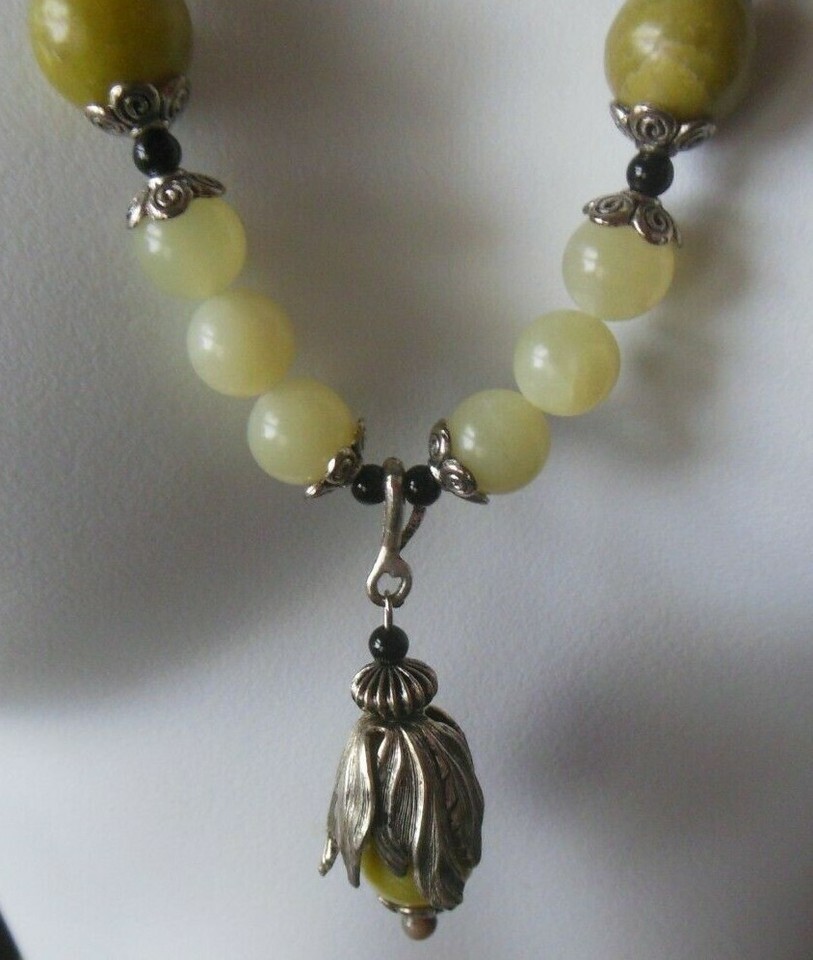 Vintage Heavy Silver-tone End-cap Jade Color Glass Bead Necklace & Earrings Set