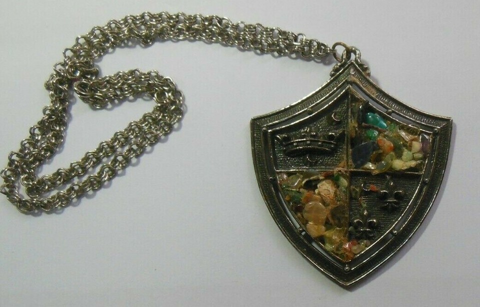 Vintage Large Shield Crown Stone Pebble Pendant Necklace