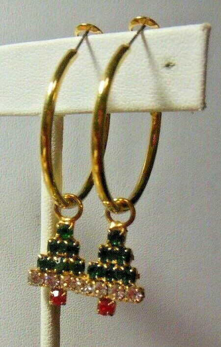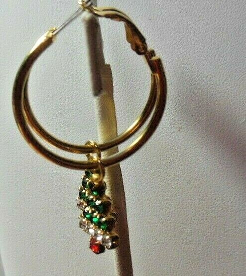 Gold-tone Faceted Rhinestone Christmas Tree Hoop Earrings